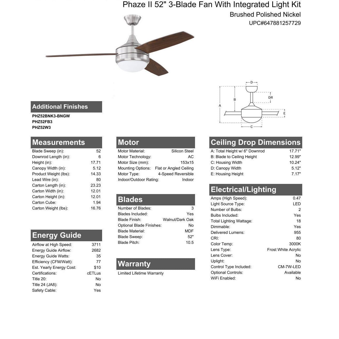 Ideal for single or multi-residential use, the modern and minimalist Phaze II 52" ceiling fan features a sleek integrated dimmable LED Light with 2 x 9W bulbs included, standard, 4-speed, reversible motor, reversible tri-blade design and included hard wired, 4-speed wall control.