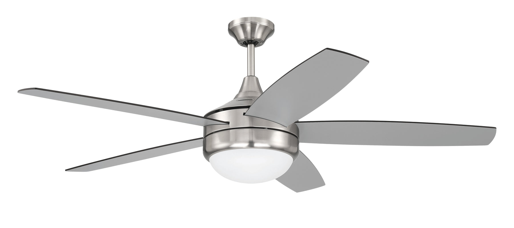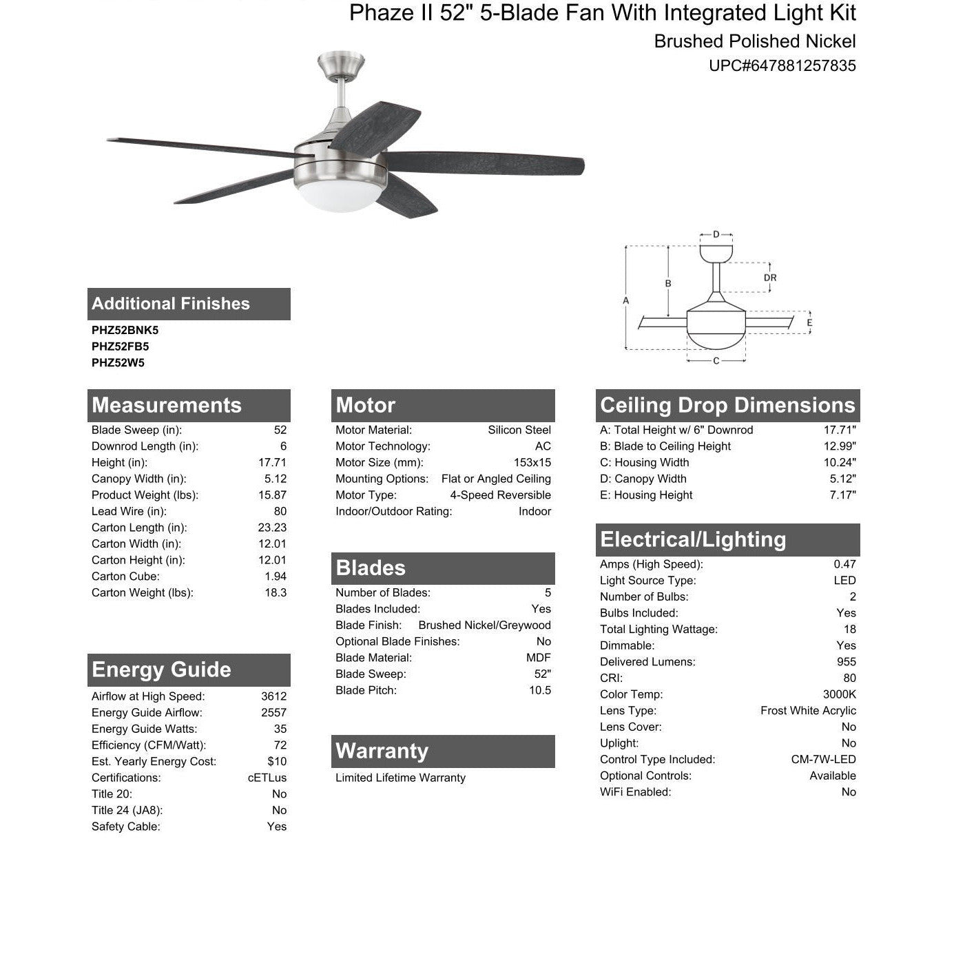 Ideal for single or multi-residential use, the modern and minimalist Phaze II 52" ceiling fan features a sleek integrated dimmable LED Light with 2 x 9W bulbs included, standard, 4-speed, reversible motor, reversible 5-blade design and included hard wired, 4-speed wall control.