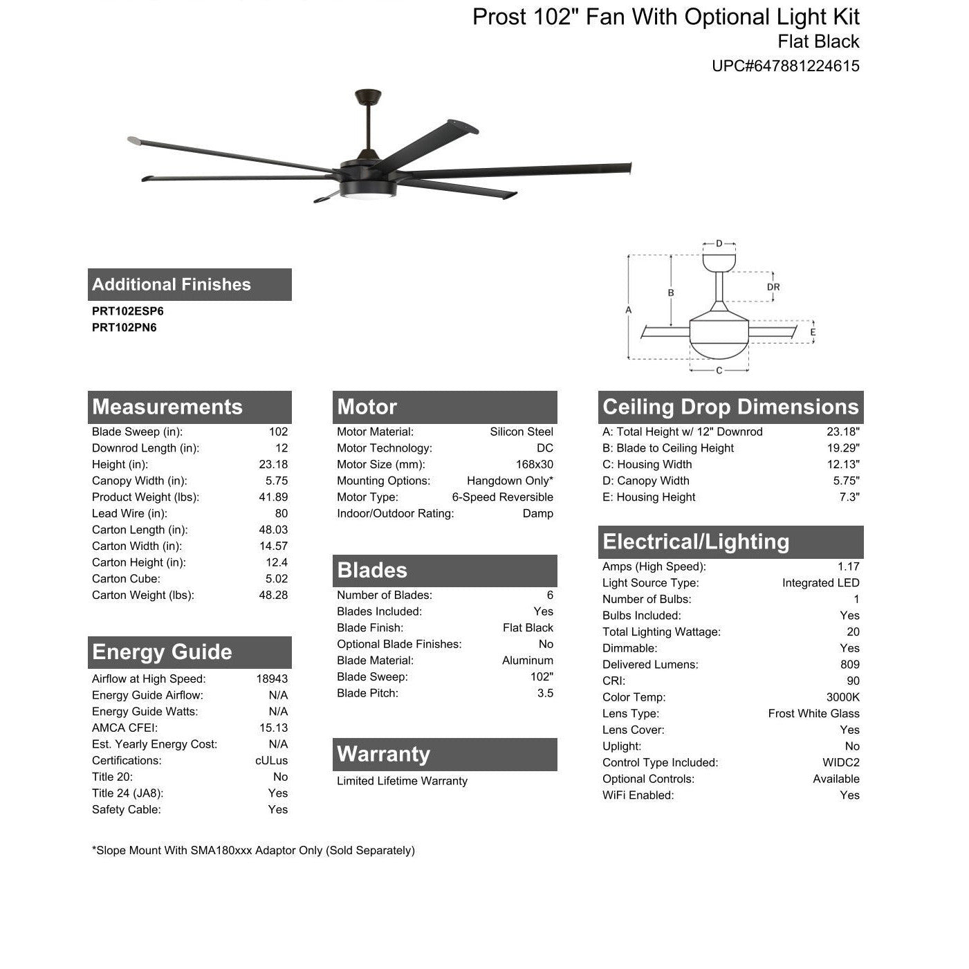 With the Prost 102" ceiling fan from Craftmade, there is a lot to celebrate! Designed to stand out and deliver maximum airflow, the indoor/outdoor damp rated Craftmade Prost 102" ceiling fan with its six custom blades features a quiet energy saving 6-speed, reversible DC motor, integrated 20W dimmable LED light with optional lens cover and is easily controlled with either the included remote control or the integrated Wi-Fi featuring breeze and timer functions compatible for use with most smart home devices, smart phones and systems.