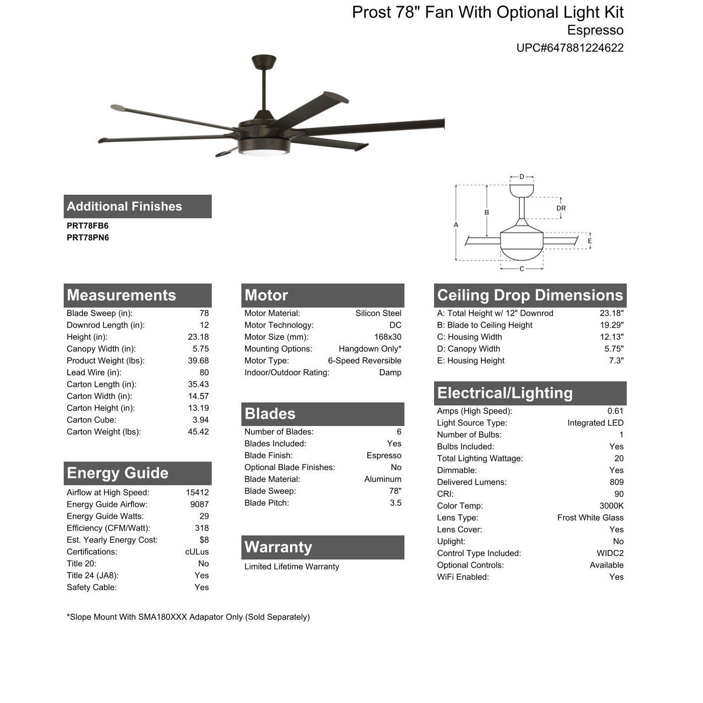 With the Prost 78" ceiling fan from Craftmade, there is a lot to celebrate! Designed to stand out and deliver maximum airflow, the indoor/outdoor damp rated Craftmade Prost 78" ceiling fan with its six custom blades features a quiet energy saving 6-speed, reversible DC motor, integrated 20W dimmable LED light with optional lens cover and is easily controlled with either the included remote control or the integrated Wi-Fi featuring breeze and timer functions compatible for use with most smart home devices, smart phones and systems.