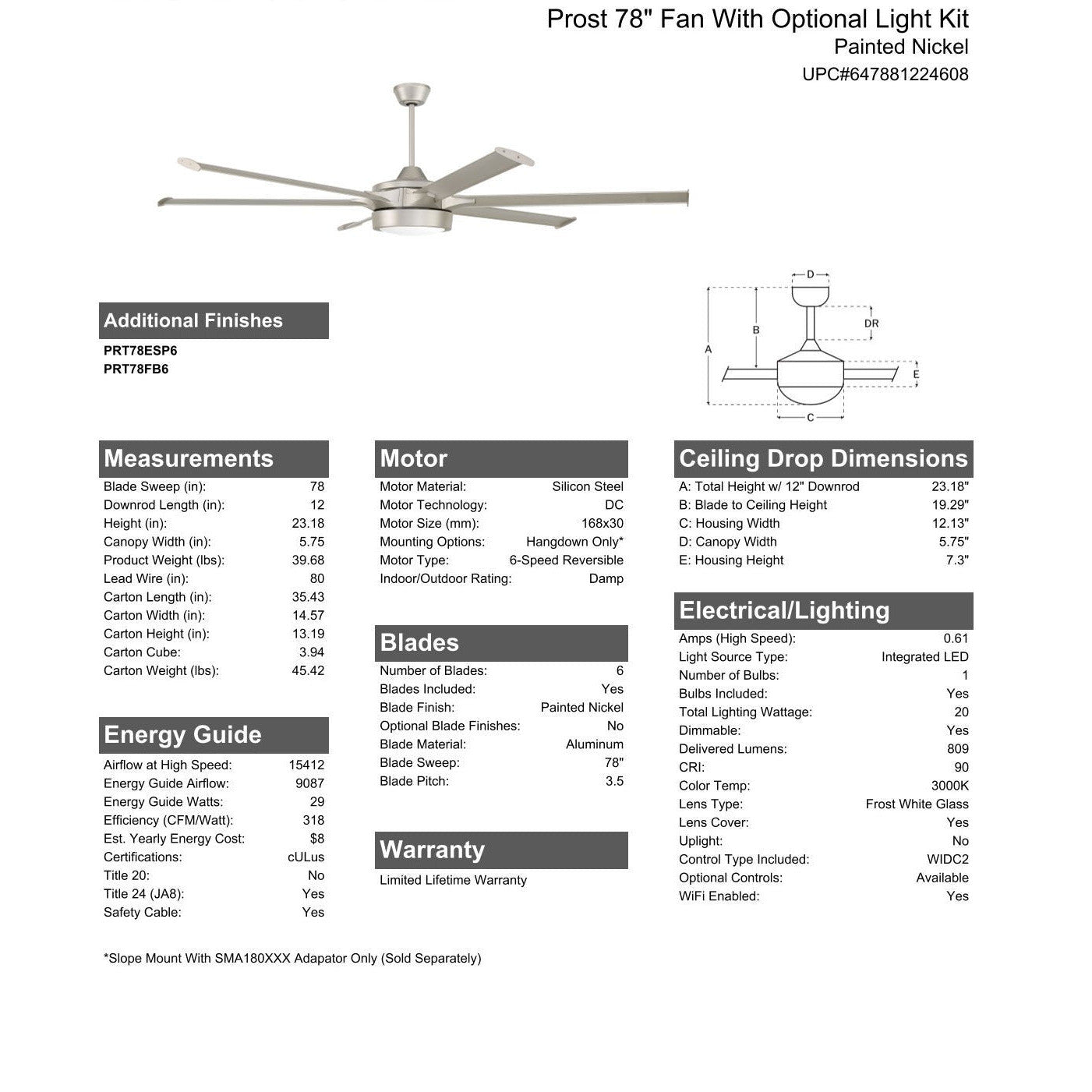 With the Prost 78" ceiling fan from Craftmade, there is a lot to celebrate! Designed to stand out and deliver maximum airflow, the indoor/outdoor damp rated Craftmade Prost 78" ceiling fan with its six custom blades features a quiet energy saving 6-speed, reversible DC motor, integrated 20W dimmable LED light with optional lens cover and is easily controlled with either the included remote control or the integrated Wi-Fi featuring breeze and timer functions compatible for use with most smart home devices, smart phones and systems.