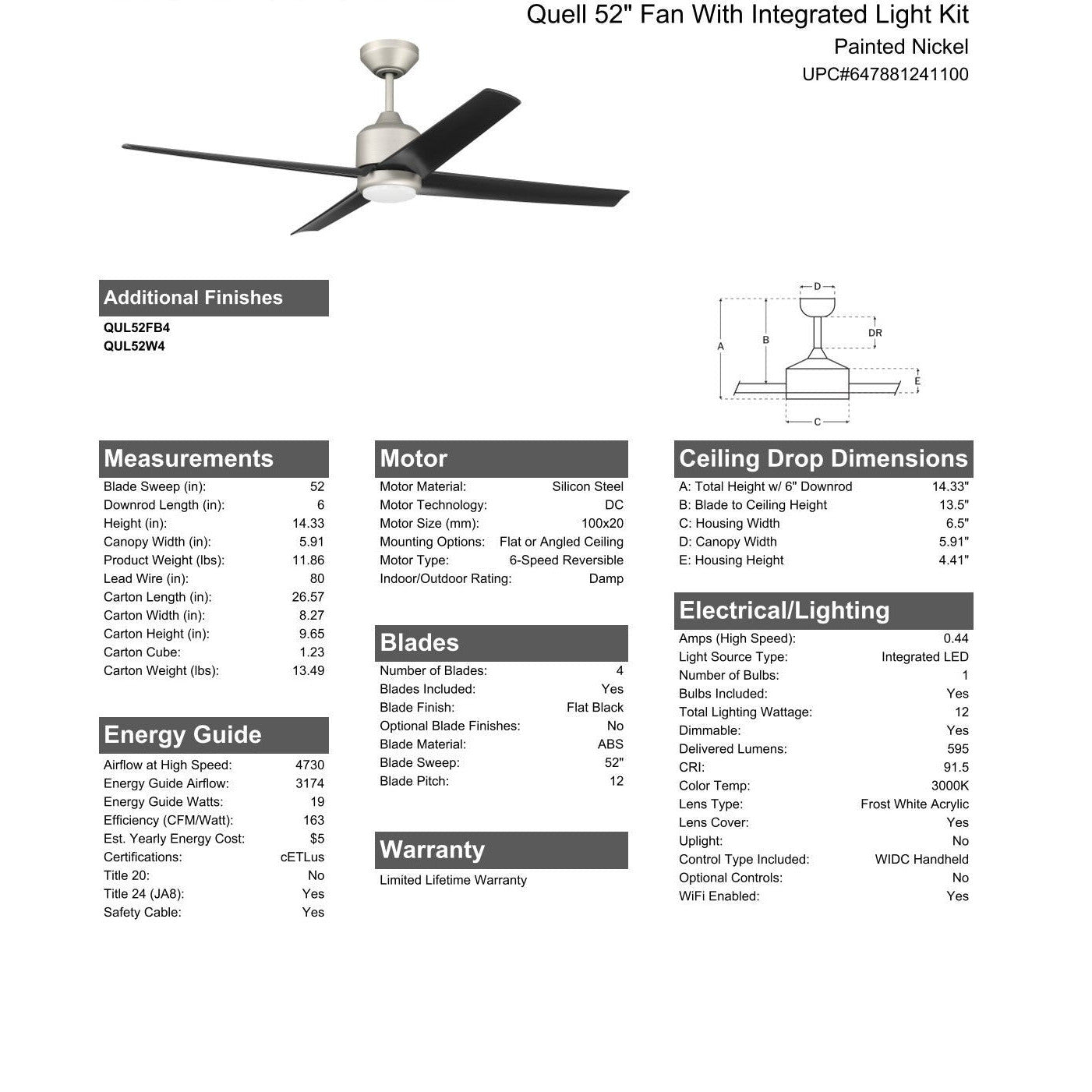 52" Quell Fan, Painted Nickel Finish, Flat Black Blades. LED Light, WIFI and Control Included