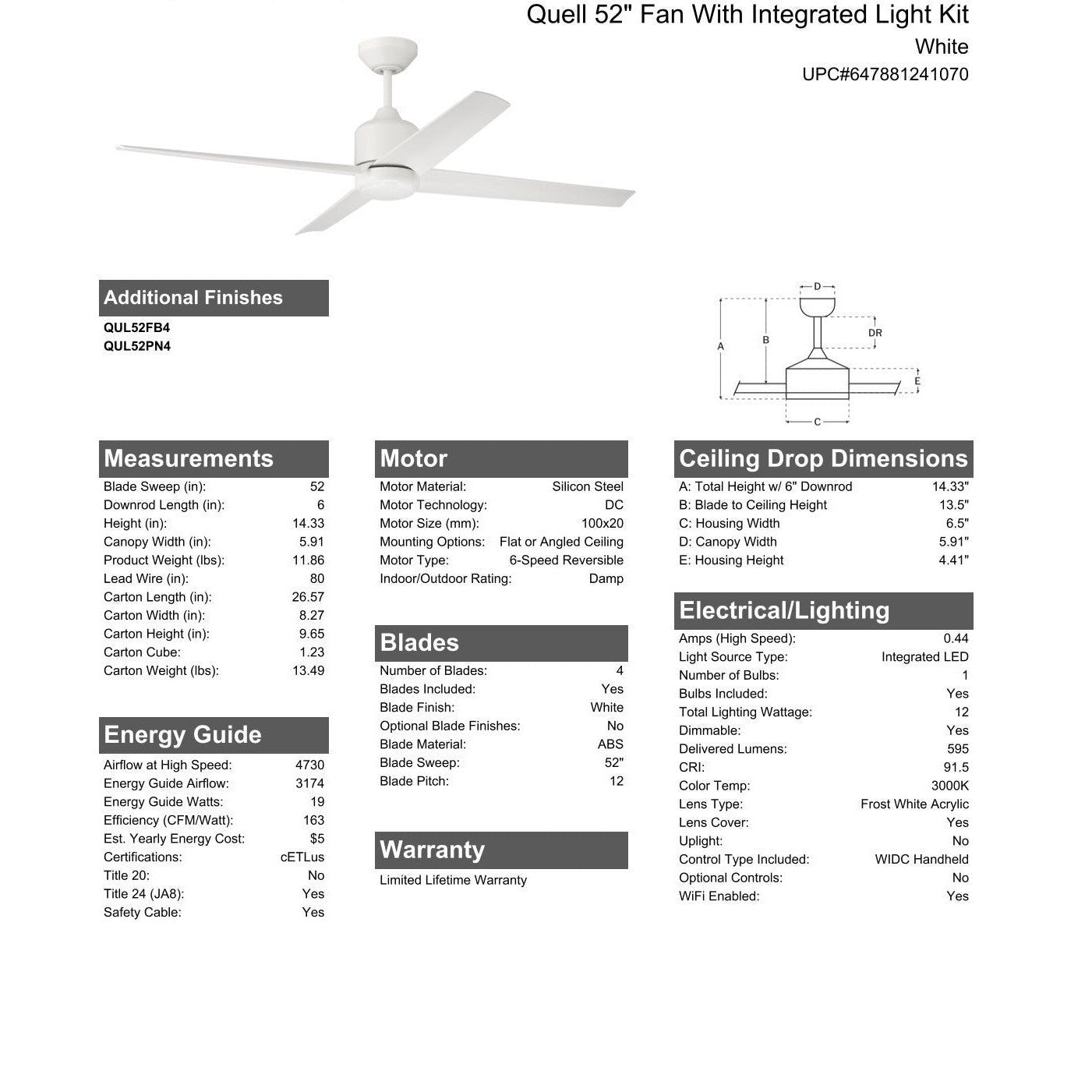 52" Quell Fan, White Finish, White Blades. LED Light, WIFI and Control Included