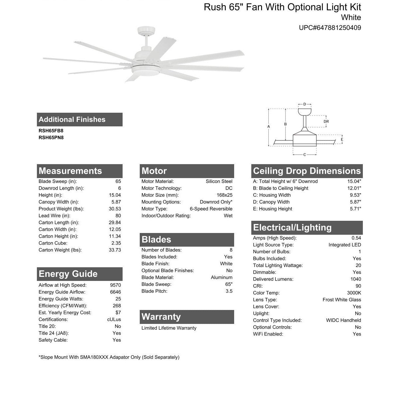 Designed to deliver maximum airflow, the indoor/outdoor wet-rated Craftmade Rush 65" ceiling fan with its eight custom aluminum blades features a quiet energy-saving 6-speed, reversible DC motor, integrated dimmable LED light with optional lens cover and is easily controlled with either the included remote control or the integrated Wi-Fi featuring breeze and timer functions compatible for use with most smart home devices, smart phones and systems with no additional hub needed.