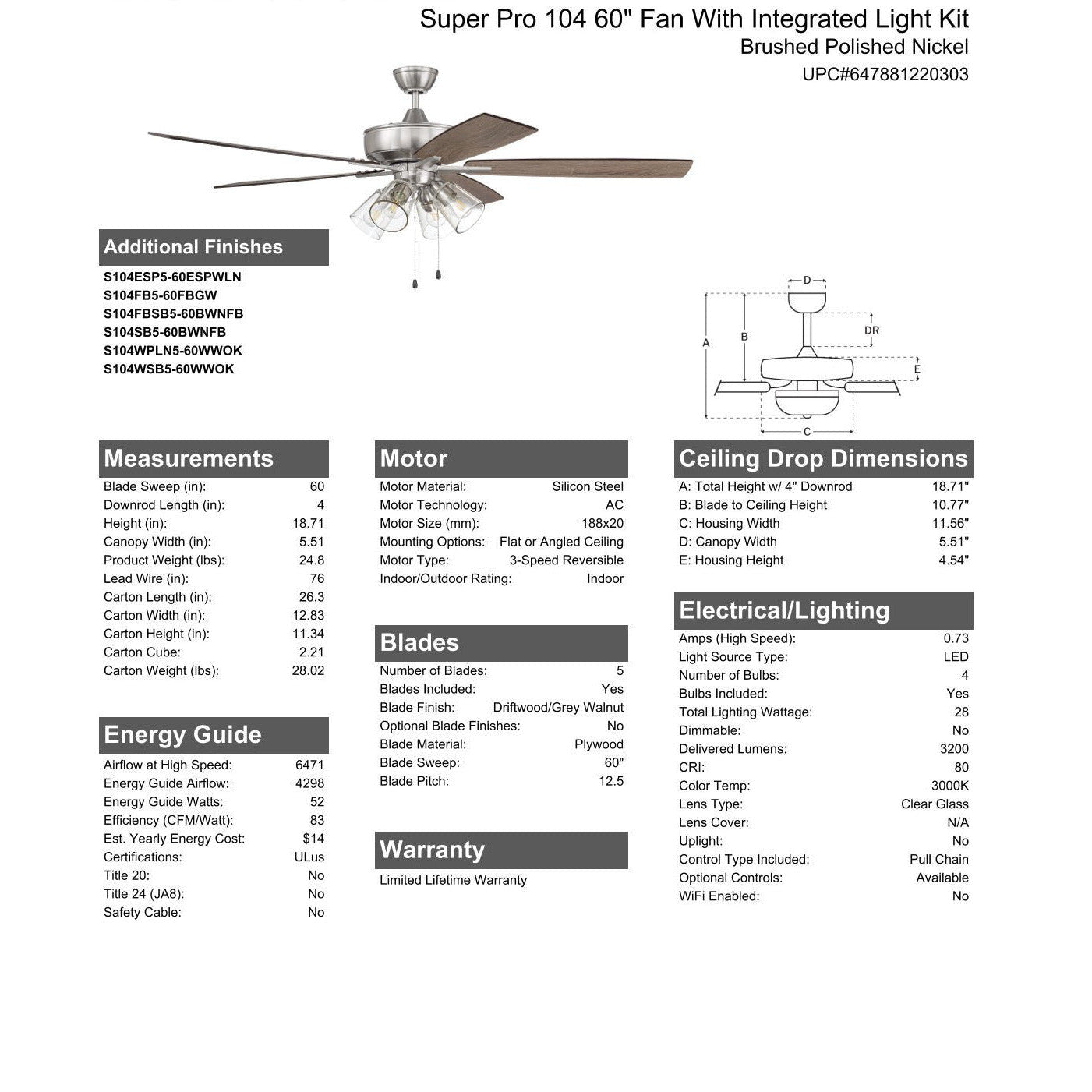 The ideal combination of excellent performance, exceptional value and timeless style, the Craftmade Super Pro 60" ceiling fan with clear glass four light (dimmable LED bulbs included) light kit featuring a clean motor, updated straight blade arms and canopy is built for performance. The dual mount, heavy-duty, 3-speed, reversible fan includes custom 60" reversible blades. Optional remote controls are available.