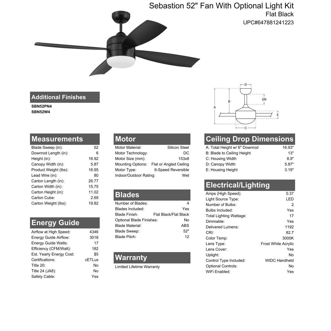 Excellent performance and timeless style combine in the 52" Sebastion smart ceiling fan from Craftmade. Wet rated for indoor or outdoor use, the 52" Sebastion features a quiet energy saving 6-speed, reversible DC motor, custom blades, integrated dimmable LED light with optional lens cover included and is easily controlled with either the included remote controls or the integrated Wi-Fi featuring breeze and timer functions compatible for use with most smart home devices, smart phones and systems with no additional hub needed.