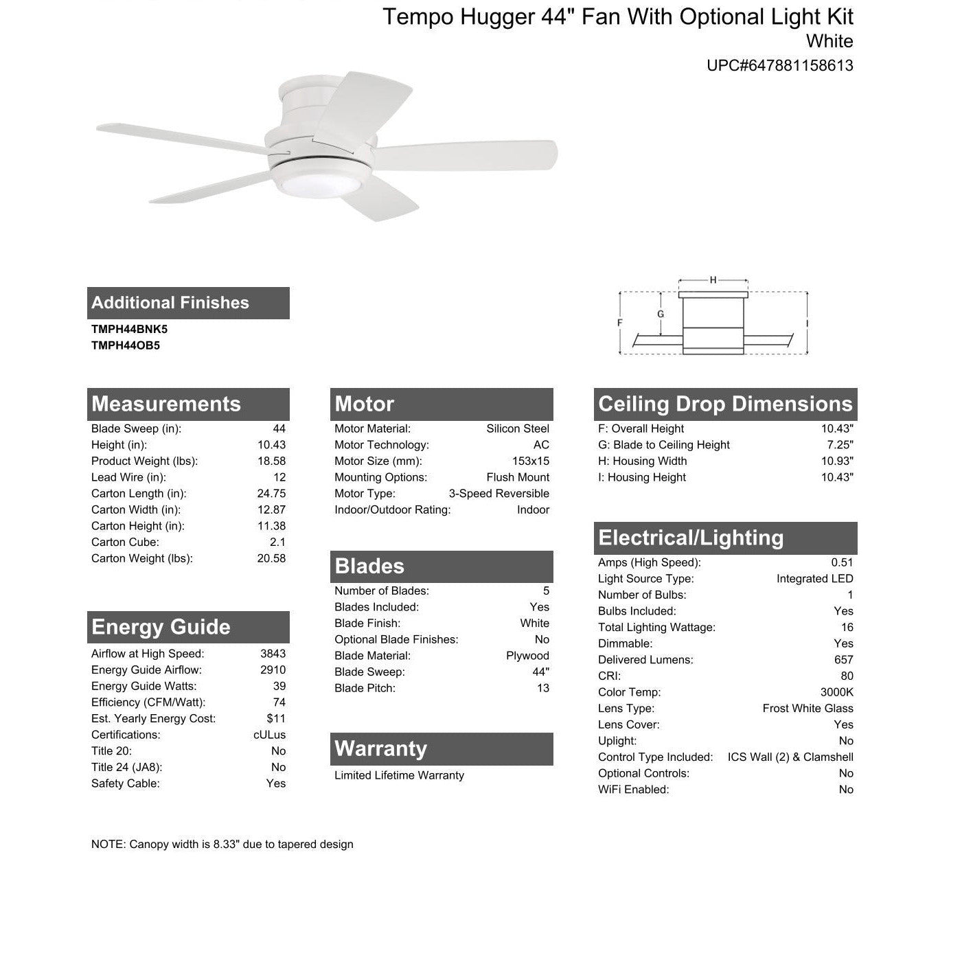 The Tempo 44" hugger fan is designed for smaller rooms and shorter ceilings. The sleek profile incorporates a 3-speed, reversible motor and dimmable LED down lighting with optional lens cover to enhance the form and function.