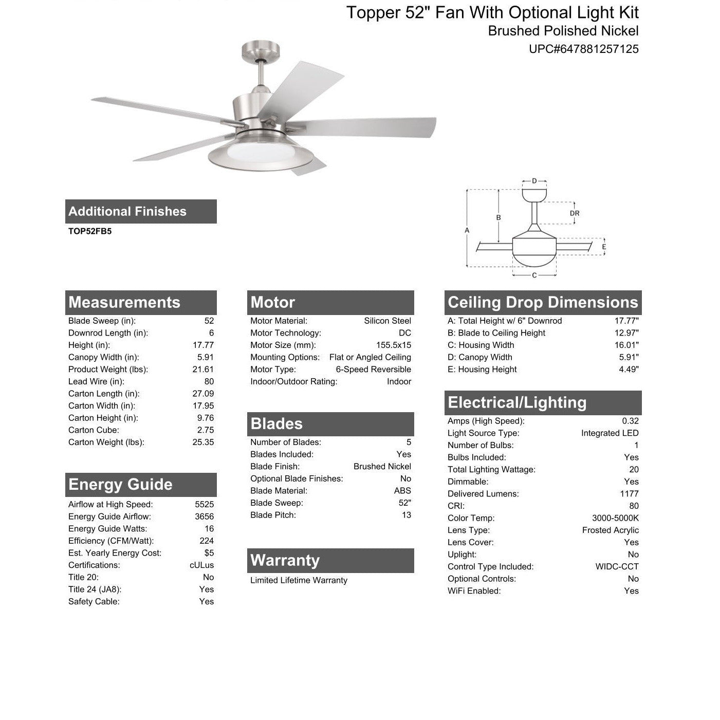 The Craftmade Topper 52" ceiling fan features a protected integrated dimmable 20W 3000K - 5000K adjustable LED light with optional lens cover, 5 custom polycarbonate blades, a quiet energy-saving 6-speed, reversible DC motor, and is easily controlled with either the included remote control or the integrated WIFI featuring breeze and timer functions compatible for use with most smart home devices, smart phones and systems with no additional hub needed. Available in two finishes, the Brushed Polished Nickel is indoor rated only. The Flat Black is indoor/outdoor wet rated.