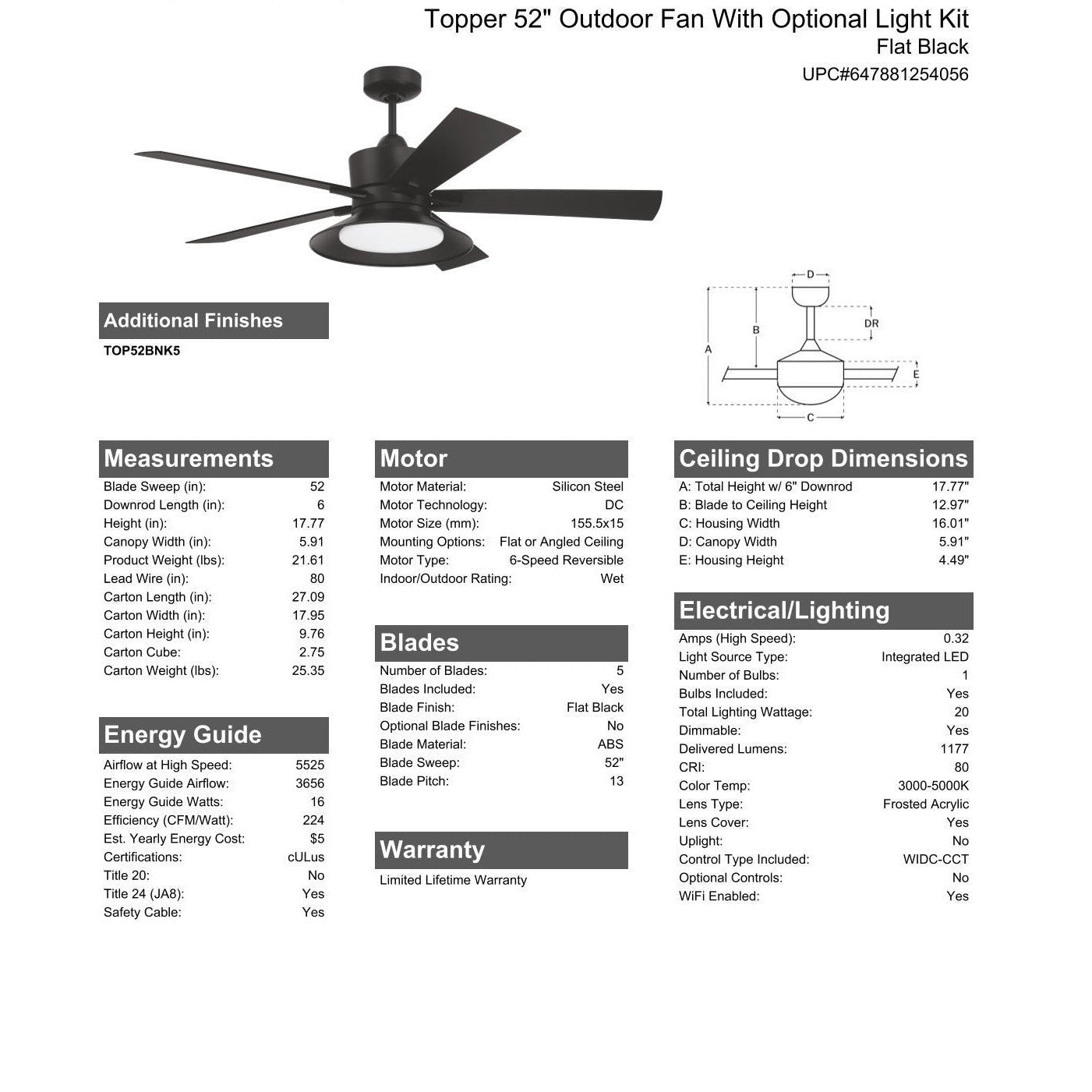 The Craftmade Topper 52" ceiling fan features a protected integrated dimmable 20W 3000K - 5000K adjustable LED light with optional lens cover, 5 custom polycarbonate blades, a quiet energy-saving 6-speed, reversible DC motor, and is easily controlled with either the included remote control or the integrated WIFI featuring breeze and timer functions compatible for use with most smart home devices, smart phones and systems with no additional hub needed. Available in two finishes, the Brushed Polished Nickel is indoor rated only. The Flat Black is indoor/outdoor wet rated.