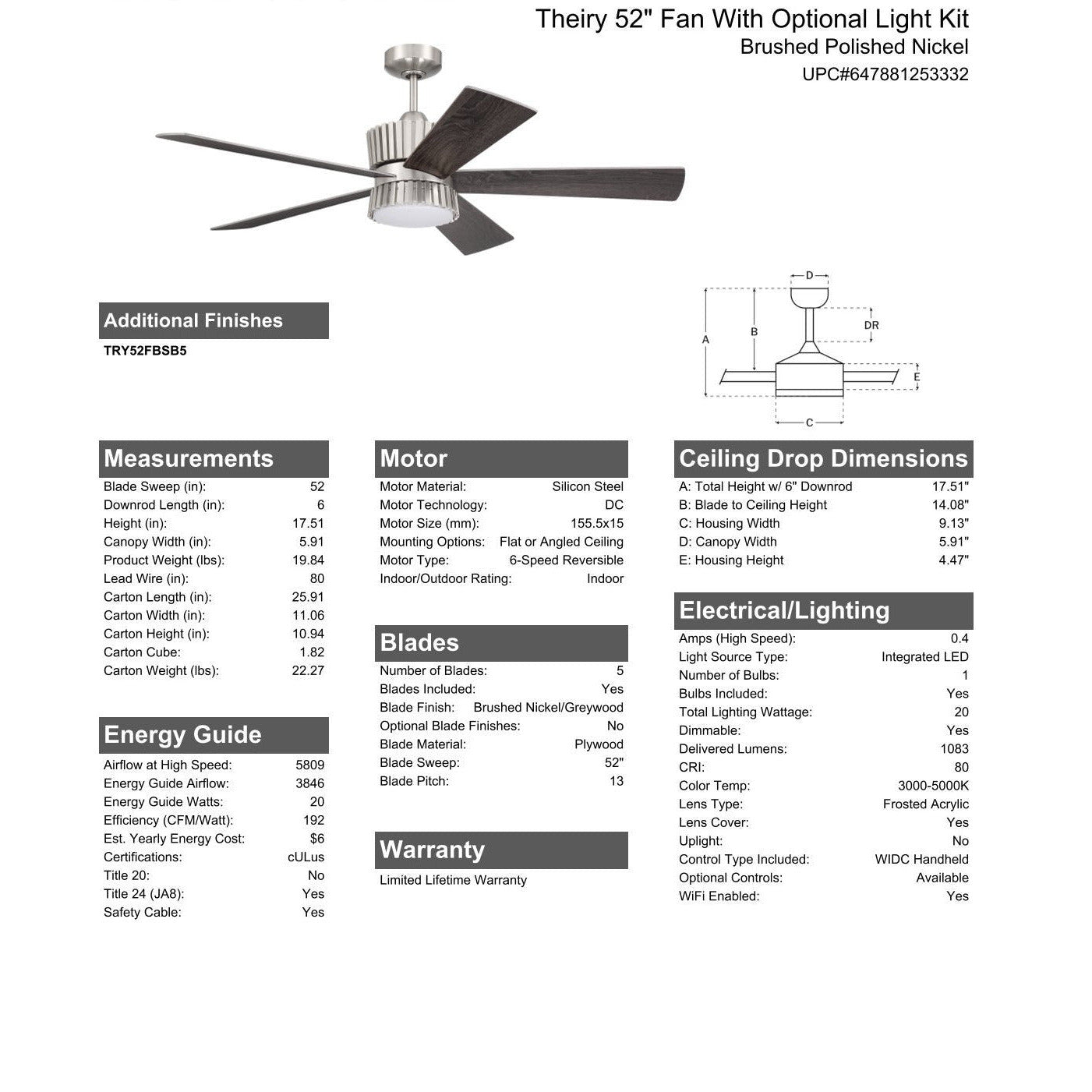 Designed with architectural detail to stand out and deliver maximum airflow, the Craftmade Theiry 52" ceiling fan features 5 custom reversible blades, a quiet energy-saving 6-speed, reversible DC motor, integrated dimmable 3000K - 5000K adjustable LED light with optional lens cover and is easily controlled with either the included remote control or the integrated WIFI featuring breeze and timer functions compatible for use with most smart home devices, smart phones and systems with no additional hub needed.