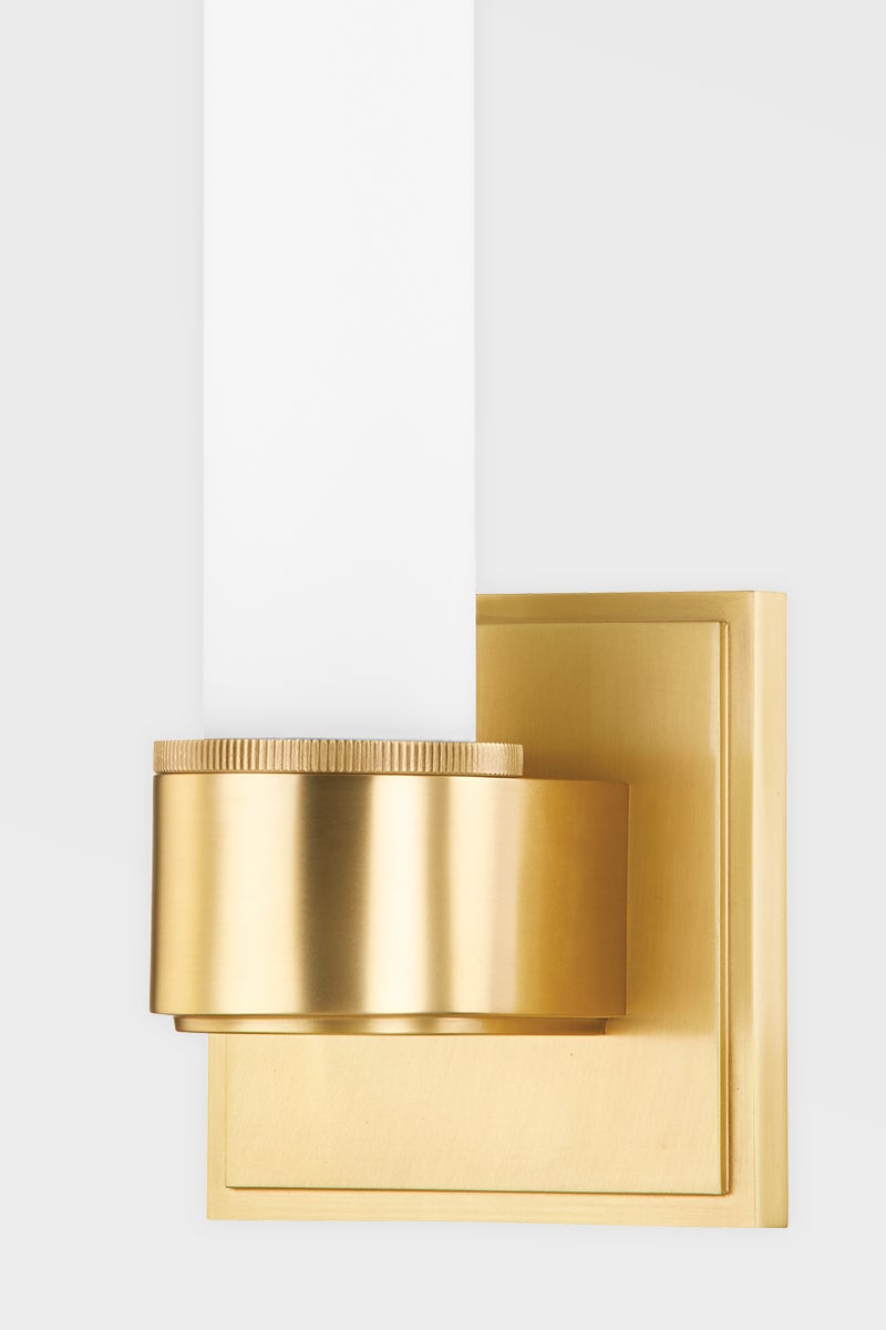 The Mill Valley Wall Sconce by Hudson Valley Lighting is a stunning addition to any space, boasting a sleek design with a height of 12.25 inches and a diameter of 4.50 inches. This elegant fixture features a white glass shade that beautifully diffuses light, accommodating one E26 medium base bulb with a maximum wattage of 60W (bulb not included). The sconce offers an extension of 4 inches and is designed for optimal functionality with a top-to-center measurement of 10.25 inches. Available in several exquisite finishes, including Aged Brass, Old Bronze, Polished Nickel, and Satin Nickel, this UL Damp rated fixture is ideal for both indoor and covered outdoor areas.