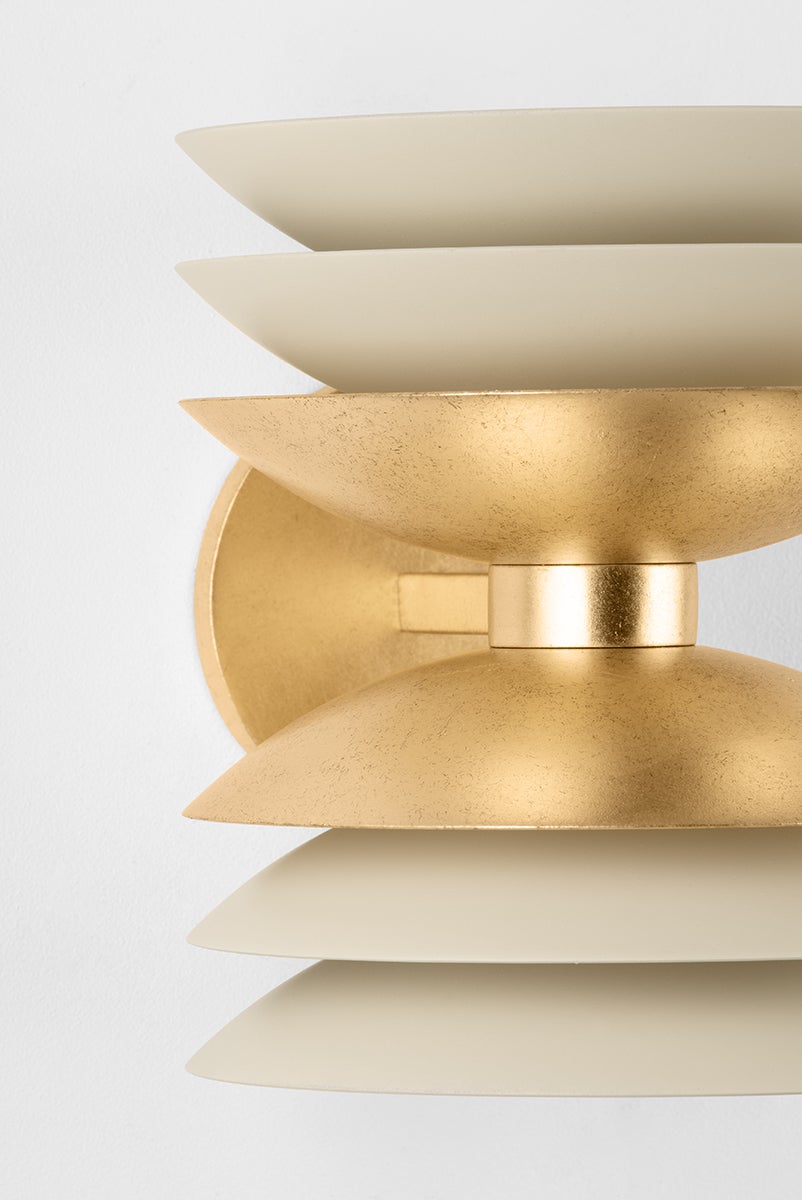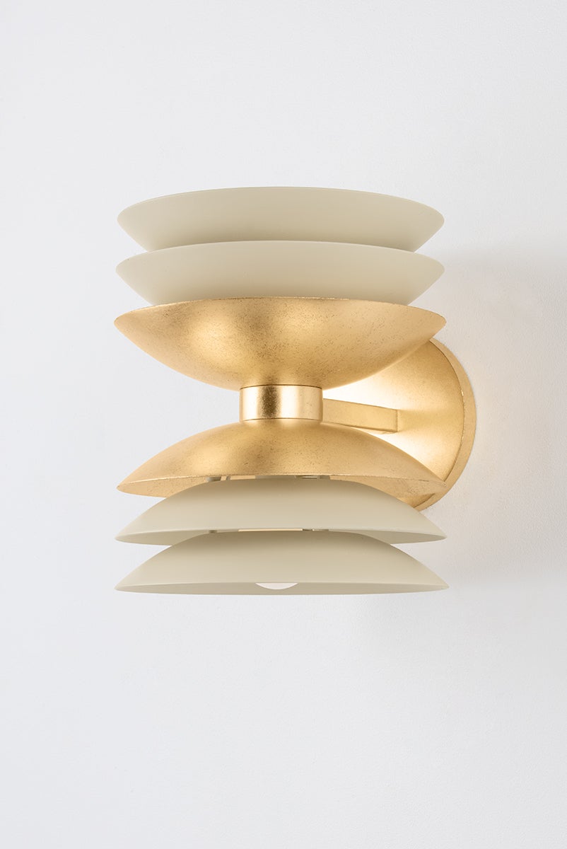 The Oneida Wall Sconce by Hudson Valley Lighting features a stunning Vintage Gold Leaf/Soft Sand finish, perfect for adding elegance to any space. This stylish sconce is designed to hold two E12 candelabra base bulbs (not included) with a max wattage of 8W each. With dimensions of 7.75 inches in width and 8.75 inches in height, it has an extension of 8.75 inches from the wall and a top-to-center height of 4.25 inches. Rated for UL Damp areas, it's an excellent choice for bathrooms and other humid environments.