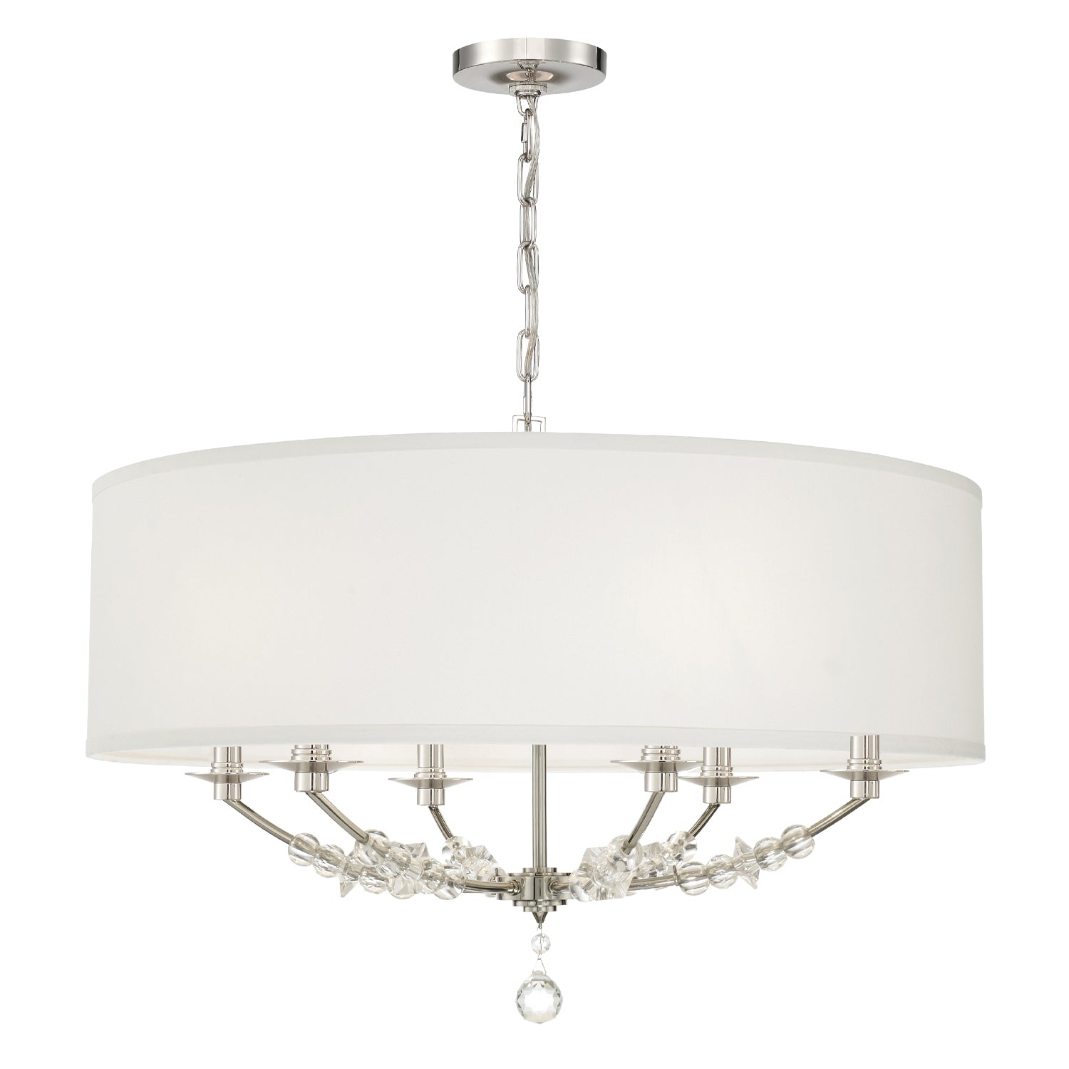 The eye catching design of the Mirage collection features a polished nickel base with arms dressed in faceted oversized crystal beads. The crisp white silk shade atop the candelabra bulbs exuding soft, ambient glow that is perfect for a contemporary appeal. Stylish, modern and minimal, the Mirage brings luxurious appeal to a variety of interior spaces