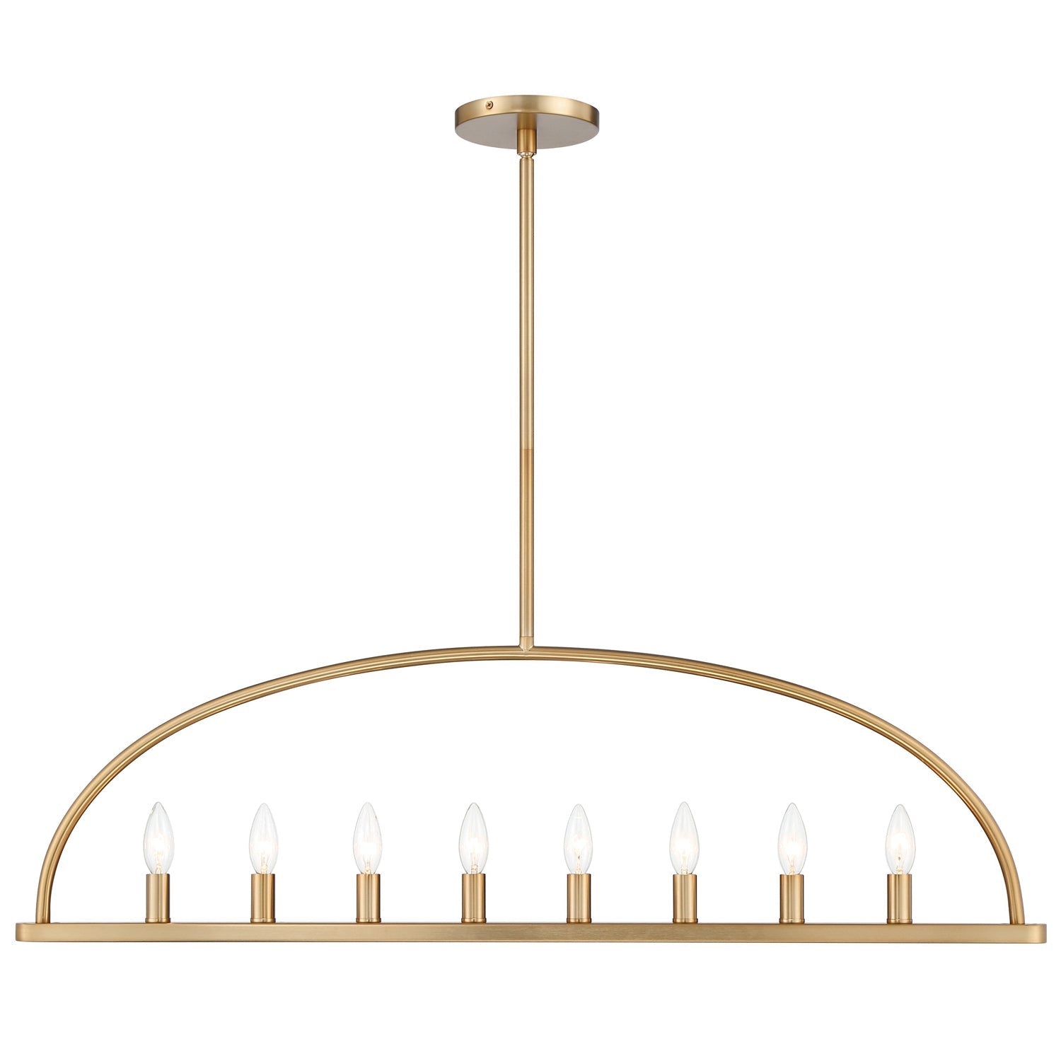 The Abbott linear chandelier presents a simple, streamlined shape and clean lines. The open-concept frame features a metal arch and a sleek, narrow rod with a series of thin bulbs. Mounted above an island or over a dining room table, this fixture appeals to a minimalist sense of style and comes with both white and gold candle sleeves. The Abbott comes in vibrant gold and black finish.