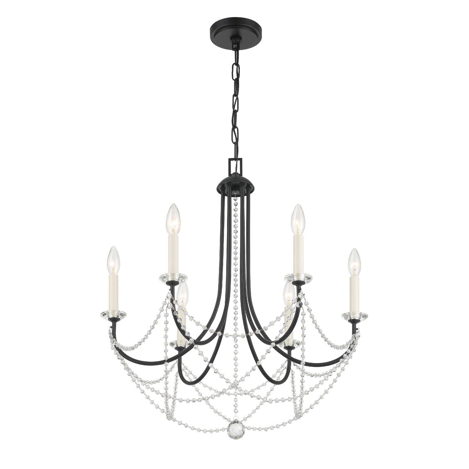 The Delilah chandelier makes a grand statement to your interior. Its swooping metal frame gracefully hangs crisscrossed cascading crystal beads from each metal arm. This modern-style crystal chandelier adds a rich and formal look to a room, making it the ultimate final touch.