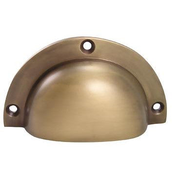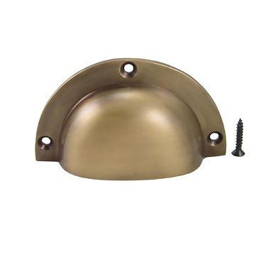 3 1/2 Inch Solid Brass Traditional Cup Pull (Antique Brass Finish) - measures 3 1/2 inches wide and 2 inches tall. Projection of 7/8 inches. Comes complete with mounting hardware.