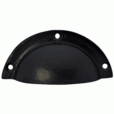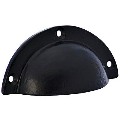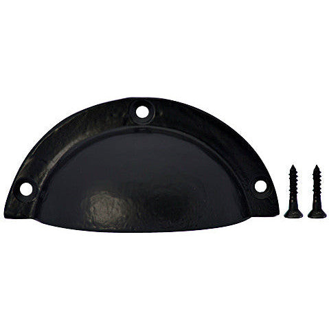 3 3/4 Inch Solid Iron Traditional Cup Pull (Matte Black Finish). Measures 3 3/4 inch wide and 2 inch tall with a projection of 3/4 inch. Comes complete with mounting hardware.