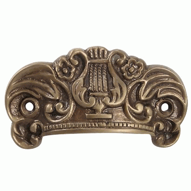 3 5/8 Inch Overall (2 3/4 Inch c-c) Solid Brass Lyre Cup Pull (Antique Brass Finish) - measures 3 1/2 inches long and 2 inches tall. Center to center mounting distance is 2 3/4 inches (69.85 mm 2.75 c-c). Highly ornate and hand finished detailing. Available in Polished Brass, Antique Brass, and Black Bronze finishes. Comes complete with mounting hardware.