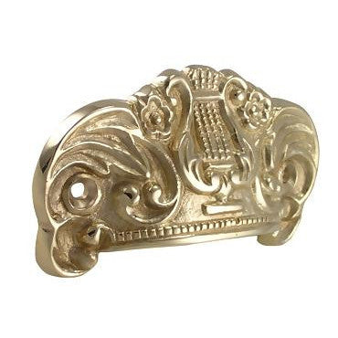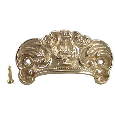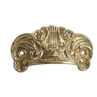 3 5/8 Inch Overall (2 3/4 Inch c-c) Solid Brass Lyre Cup Pull (Polished Brass Finish) - measures 3 1/2 inches long and 2 inches tall. Center to center mounting distance is 2 3/4 (69.85 mm 2.75 c-c) inches. Highly ornate and hand finished detailing. Available in Polished Brass, Antique Brass, and Black Bronze finishes. Comes complete with mounting hardware.