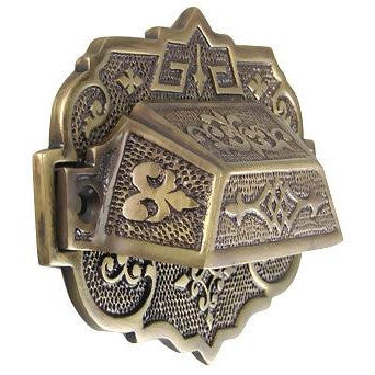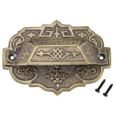 4 3/8 Inch Overall (3 1/4 Inch c-c) Solid Brass Eastlake Cup or Bin Pull With Backplate (Antique Brass Finish) - measures 4 inches long and 1 1/4 inches tall. Backplate measures 4 3/8 inches long and 3 1/4 inches tall (88.2 mm 3.25 c-c). Center to center mounting distance is 3 5/8 inches. Highly ornate and hand finished detailing. Available in Polished Brass, Antique Brass, and Black Bronze finishes. Comes complete with mounting hardware.