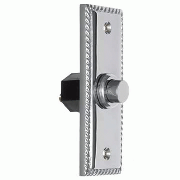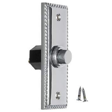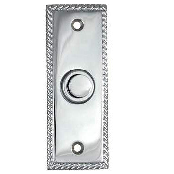 3 1/3 Inch Solid Brass Doorbell Button (Chrome Finish) - mounts with two brass screws (included) and it has two lead contacts on the back. Measures 3 1/3 Inches by 1 1/3 Inches. Uses 24 Volt maximum (standard doorbell circuits). Button is made from color matching resin material.