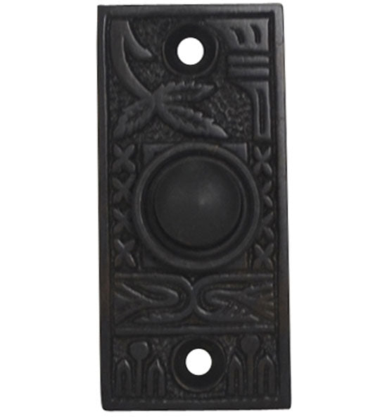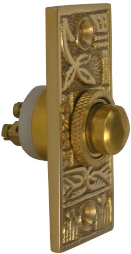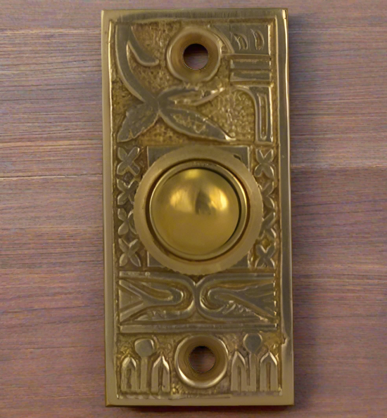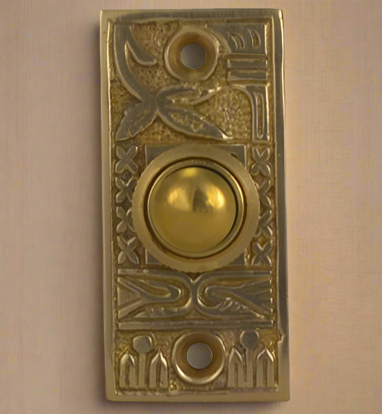 This lavish broken leaf style door bell is finished in a fine polished brass. Measures 2 1/4 Inches tall by 1 Inch wide. Finishes Available: Polished Brass, Antique Brass, and Black Bronze. Direct screw mount and connects on normal door bell voltage with two common wires. The average lead time for this particular product is 3 to 4 Business Days.