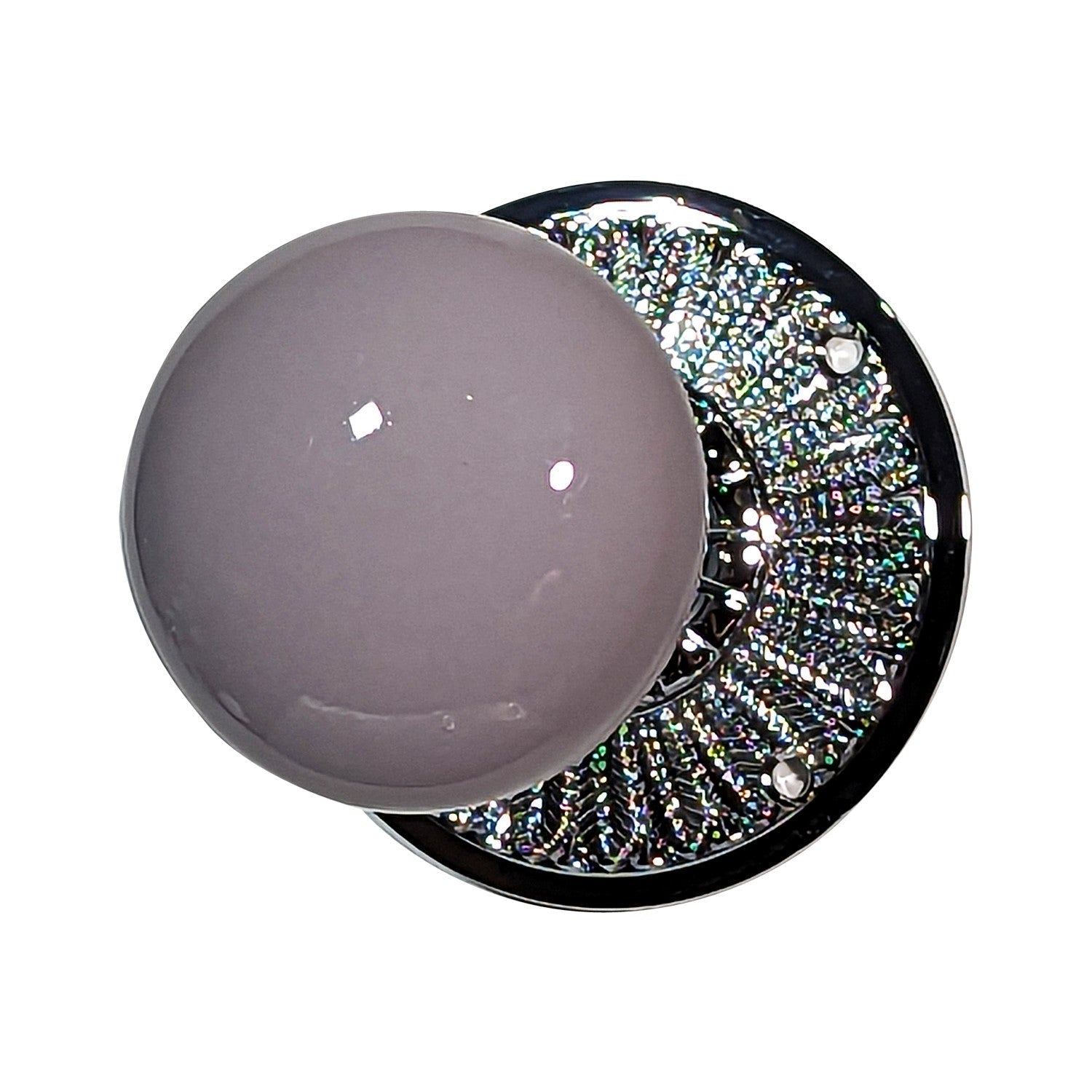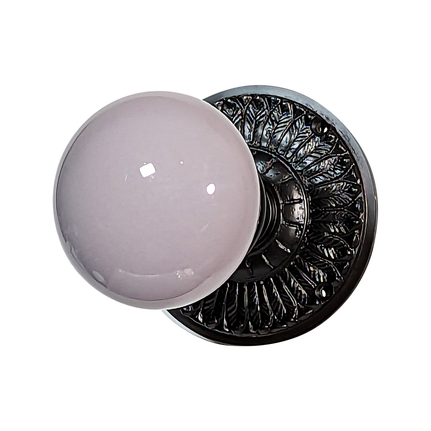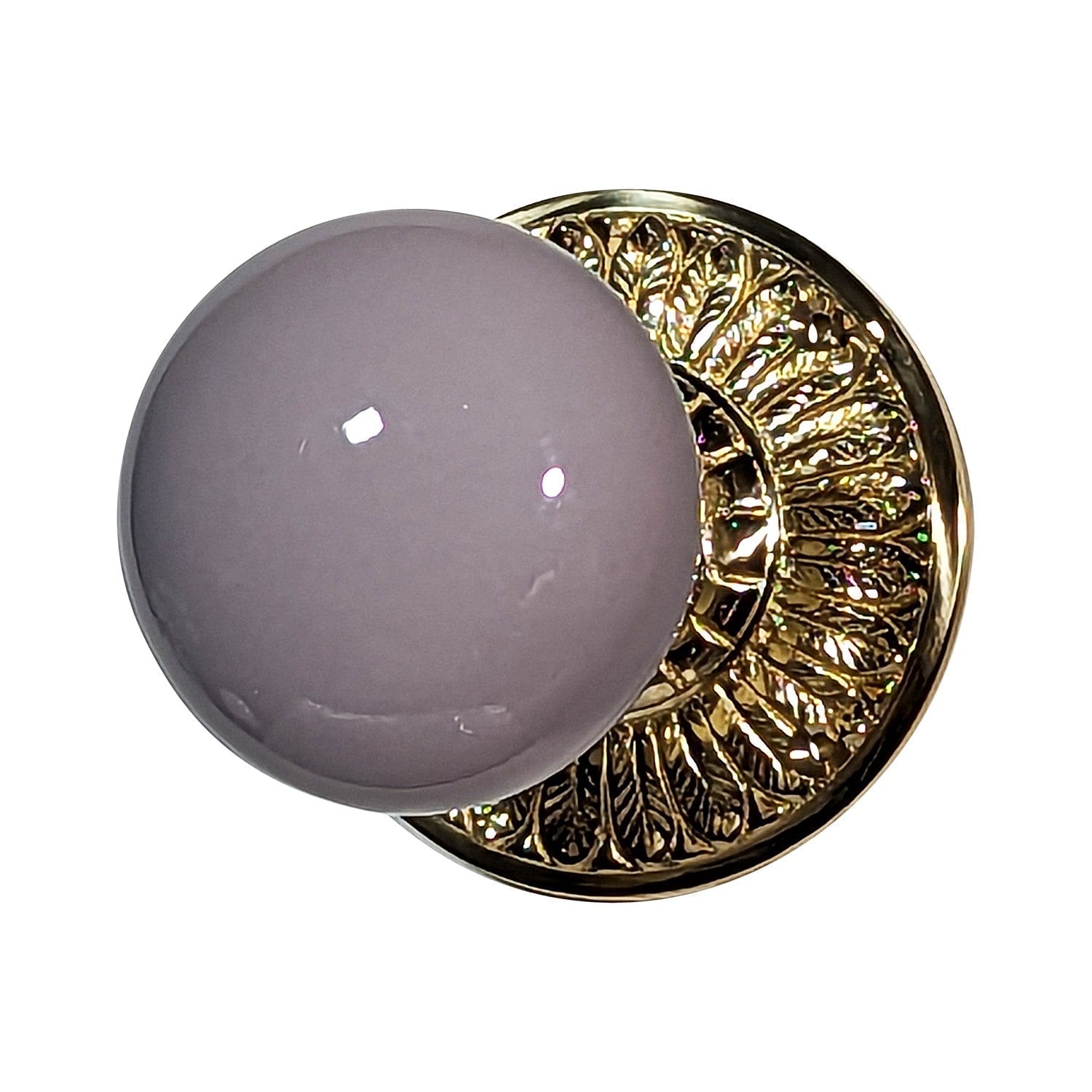 • Grey Porcelain Door Knob with Brass Feathers Rosette - The genuine grey porcelain and measures 2 3/8 inches in diameter (approximate) and has a projection of 2 1/4 inches. Solid brass rosette plates screws directly into the door with three wood screws and measures 3 1/8 inches in diameter.