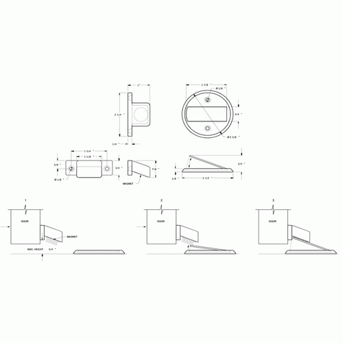Baseboard mounted magnetic door hold and door stop - a solid brass universal modern Baseboard mounted stop (Polished Brass Finish) - this measures 2 3/8 inches in Diameter. It also comes complete with the mounting screws. This style of door stop provides protection for the door by preventing it from banging against a wall causing damage to drywall or plaster and paint. This door stop is available in many designer finishes and comes complete with the mounting hardware.
