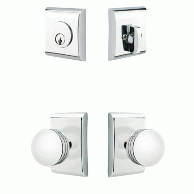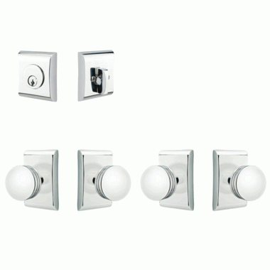 Emtek Single Door Entryway Bern Knob With Neos Rosette - this entryway set measures 2 1/2 inches wide. The deadbolt plate measures 2 3/4 inches tall, and the door plate measures 4 5/8 inches tall. Various styles of knobs available at no additional charge. Entryway backset comes as 2 3/8 inch standard and a 2 3/4 inch backset is available if required. The overall grip thickness is 1 1/16 inch. The clearance between the door and grip is 1- 1 3/8 inches. The plates have a thickness of 7/16 inch. This is a complete set and it comes with tubular latch mechanisms, strike plates, complete knob sets, internal mechanisms, deadbolts and all mounting hardware.