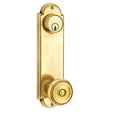 Solid Brass Delaware Keyed Style Passage Entryway Set (Polished Brass Finish) - This door entryway set features a solid brass construction and a wonderful polished brass finish. Measures 2 1/2 inches wide by 7 1/8 inches tall with a 5 1/2 inch center to center hole spacing. Also includes a pair of standard 2 1/8 inch door preps. Included the brass Waverly knob that's shown. Sold as a complete set, with latch and strike plate included. Standard latch is for 2 3/8 inch backset. Must specify if a 2 3/4 inch backset is required.