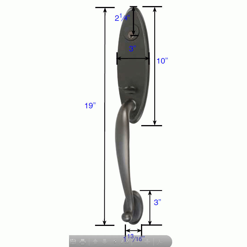 Solid Brass Marietta Style Entryway Set (Oil Rubbed Bronze Finish) - this entryway set measures 3 inch wide by 19 inch tall. Various styles of knobs available at no additional charge. Entryway set deadbolt to knob center-to-center distance is 5 1/2 inches. Entryway backset comes as 2 3/8 inch standard and a 2 3/4 inch backset is available if required. The overall grip thickness is 1 3/4 inch. The clearance between the door and grip is 2 inches. The plates have a thickness of 1/2 inch. This is a complete set and it comes with tubular latch mechanisms, strike plates, complete knob sets, internal mechanisms, deadbolts and all mounting hardware.