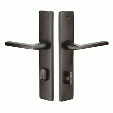 Solid Brass Modern Rectangular Style Stretto Passage Entryway Set (Oil Rubbed Bronze Finish) - The entryway set shown here features a terrific oil rubbed bronze finish and a carefully crafted rectangular shape design. Measures 2 inches wide by 10 inches tall. Features the Helios style brass lever shown and a single keyed entry style. Includes a 3 3/8 inch center to center hole spacing with narrow 1 1/4 inch door preps. A 28 degree latch is available for 2 3/8 inch backsets. Please specify if a 2 3/4 inch bracket is required. Sold as a complete double-sided set with the knobs, plates with deadbolt and thumb turn, latch and strike plate.