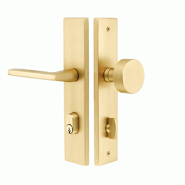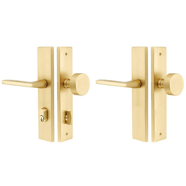 Solid Brass Modern Rectangular Style Stretto Passage Entryway Set (Polished Brass Finish) - The entryway set shown here features a smooth polished brass coating and a carefully crafted rectangular shape design. Measures 2 inches wide by 10 inches tall. Features a single keyed construction and the round bras style knob. Includes a 3 3/8 inch center to center hole spacing with narrow 1 1/4 inch door preps. A 28 degree latch is available for 2 3/8 inch backsets. Please specify if a 2 3/4 inch backset is required. Sold as a complete double-sided set with the knobs, plates with deadbolt and thumb turn, latch and strike plate.