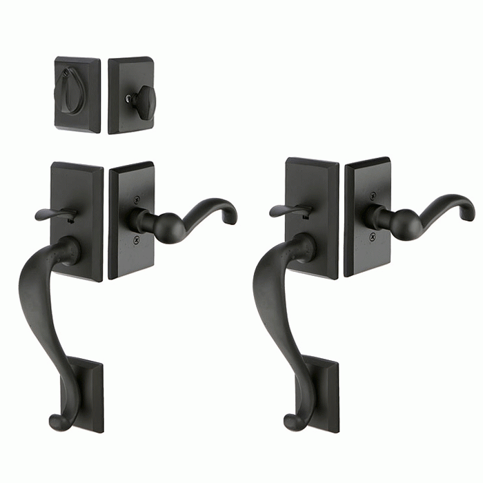 Solid Brass Rectangular Style Entryway Set (Flat Black Finish) - this entryway set measures 2 13/16 inch wide. The deadbolt plate measures 3 inches tall, and the door plate measures 4 3/4 inches tall. Various styles of knobs available at no additional charge. Entryway backset comes as 2 3/8 inch standard and a 2 3/4 inch backset is available if required. The overall grip thickness is 1 11/16 inch. The clearance between the door and grip is 1 7/8 inches. The plates have a thickness of 1/2 inch. This is a complete set and it comes with tubular latch mechanisms, strike plates, complete knob sets, internal mechanisms, deadbolts and all mounting hardware.