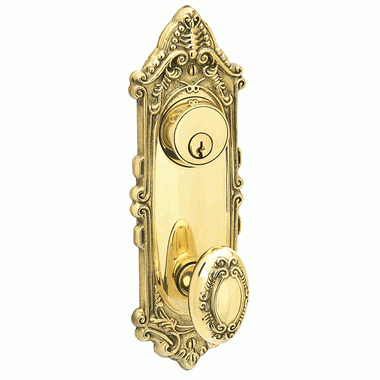 Solid Brass Victorian Keyed Style Passage Entryway Set (Polished Brass Finish) - This gorgeous locking door entryway set features a carefully crafted exterior with a polished brass finish and solid brass construction. Measures 2 3/4 inches wide by 7 3/4 inches tall. Includes a 3 5/8 inch center to center hole spacing and a pair of 2 1/8 inch door preps. Sold as a complete set with latch and strike plate included. Standard latch is for 2 3/8 inch backset. Must specify if a 2 3/4 inch backset is required.