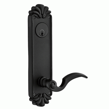 Tuscany #16 Keyed Style Passage Entryway Set (Flat Black Bronze Finish) - This stunning locking door entryway features a rustic, yet elegant construction, complete with a flat black bronze finish. Measures 2 1/2 inches wide by 10 1/8 inches tall. Includes a 5 1/2 inch center to center hole spacing with two standard 2 1/8 inch door preps. Sold as a complete set, with lever, latch and strike plate. If selecting the Double Door Entryway set, you will receive one Double Dummy Pair and one Single Keyed Set. Standard latch is for 2 3/8 inch backset, must specify if a 2 3/4 inch backset is required.