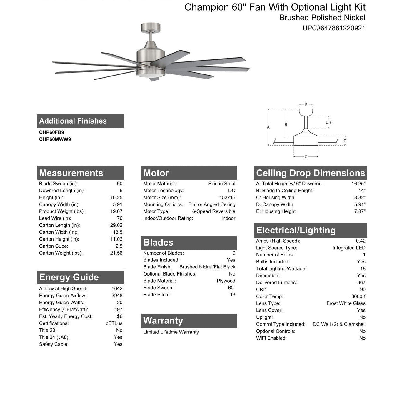 With a heavy-duty, energy efficient DC motor, integrated 18W dimmable LED light with optional lens cover, and included remote control, the dual mount Champion 60" nine blade ceiling fan will earn your respect.