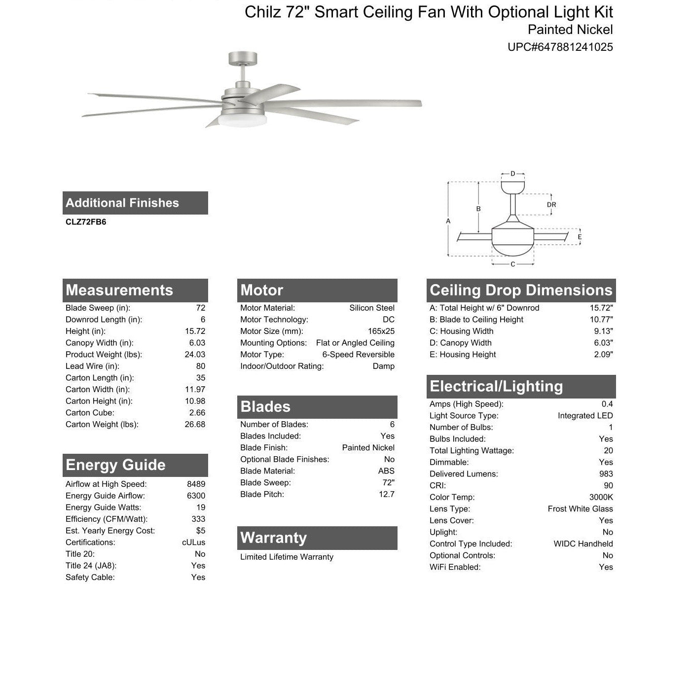 The Craftmade Smart 72" Chilz indoor/outdoor damp rated six blade ceiling fan is designed to deliver maximum airflow with quiet efficiency and convenience. The Chilz features an energy saving 6-speed, reversible DC motor, integrated dimmable LED light with optional lens cover and is easily controlled with either the included remote control or the integrated WIFI featuring breeze and timer functions compatible for use with most smart home devices, smart phones and systems with no additional hub needed.
