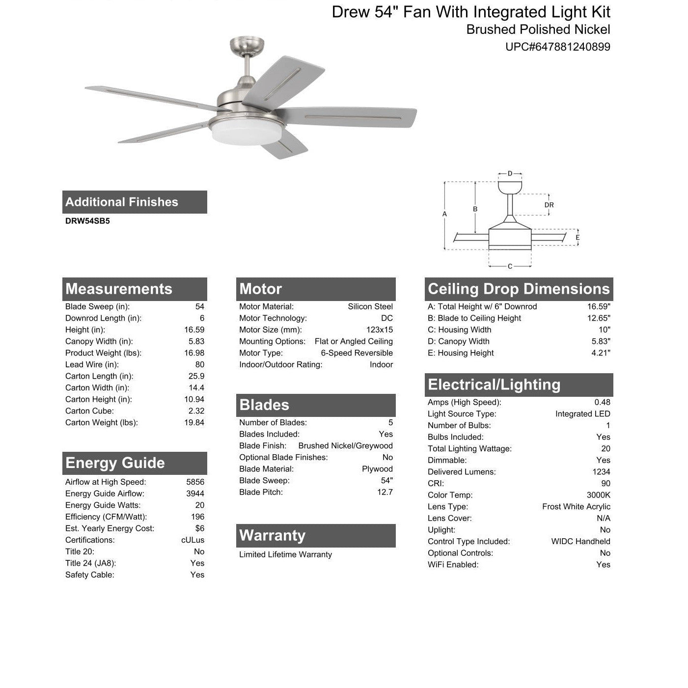 The Drew 54" Smart ceiling fan combines style, performance and the convenience of Wi-Fi functionality. Featuring a quiet energy saving 6-speed, reversible DC motor, set of five custom reversible blades with decorative detail, integrated dimmable LED white light and is easily controlled with either the included remote controls or the integrated Wi-Fi featuring breeze and timer functions compatible for use with most smart home devices, smart phones and systems with no additional hub needed.