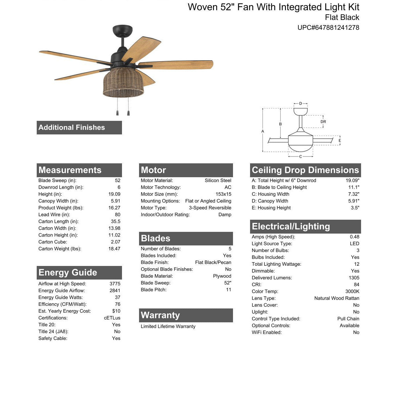 Damp rated for both indoor and outdoor installation, the Craftmade 52" Woven ceiling fan features a unique woven rattan 3 Light dome with LED bulbs included and reversible pecan/flat black blades that combine to create a oasis of natural beauty to enhance any space with style and performance delivered by a quiet standard, 3 speed reversible motor. Optional remote and wall controls sold separately.