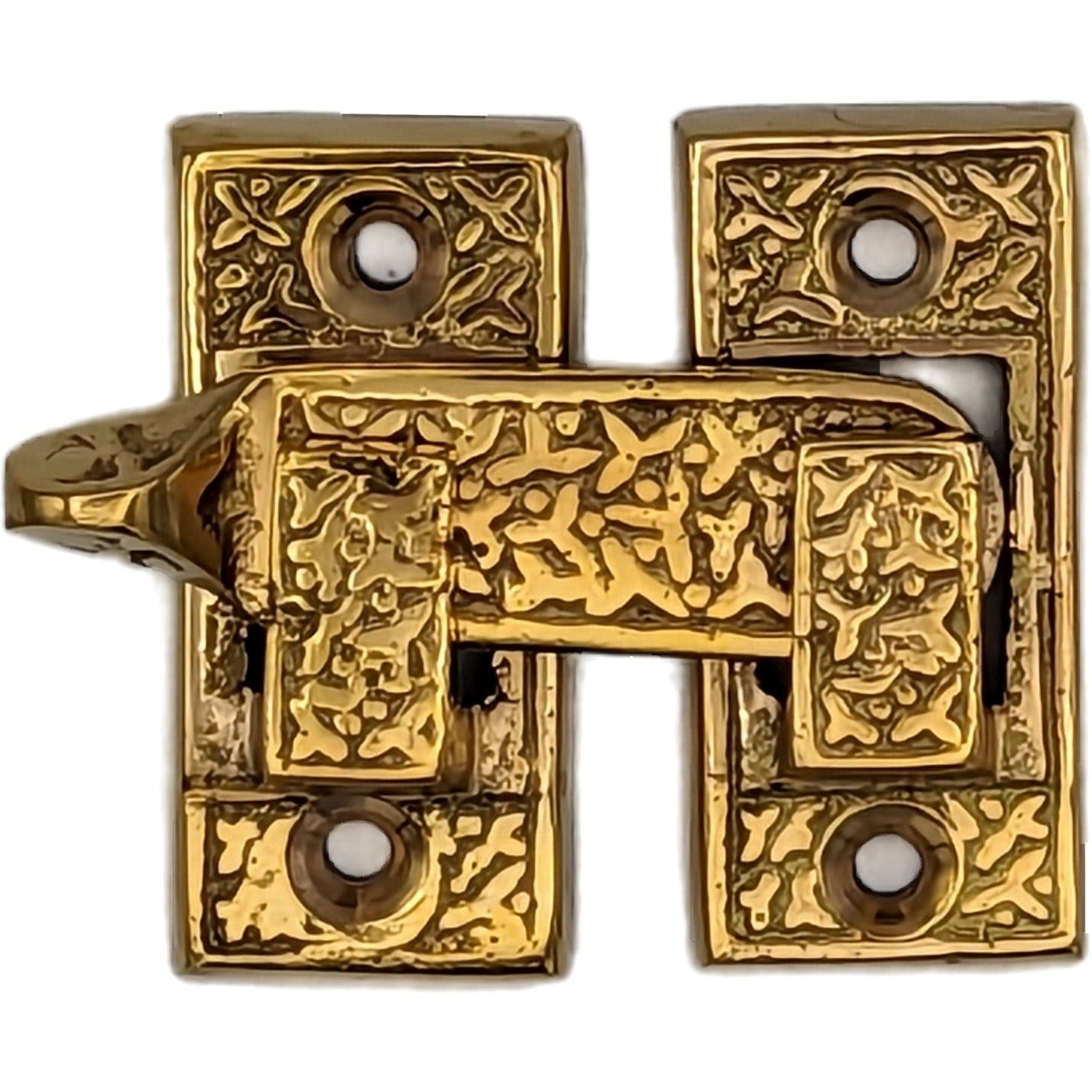 This cabinet latch measures 2 3/8 inches wide (maximum) by 2 7/8 inches tall (maximum). This comes complete with the mounting hardware. This product comes as an unlacquered natural brass and it will patina over time. A high strength lacquer coating is available upon request. Reversible for left or right opening cabinets. Comes in a Polished Brass, Antique Brass, or Black Bronze finish. The average lead time for this particular product is 1 to 2 Business Days.