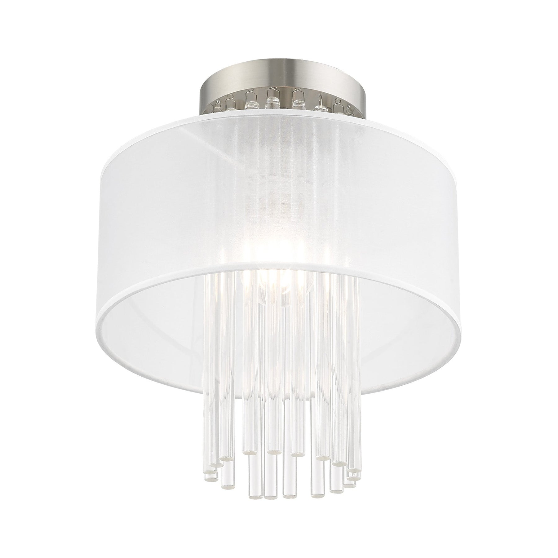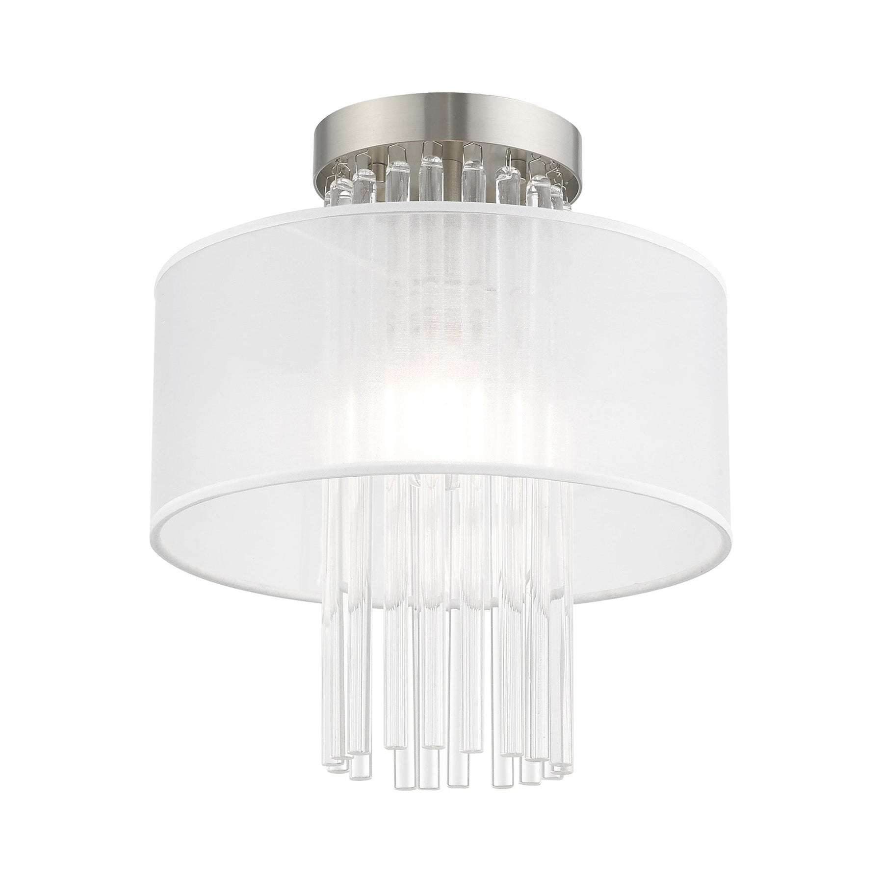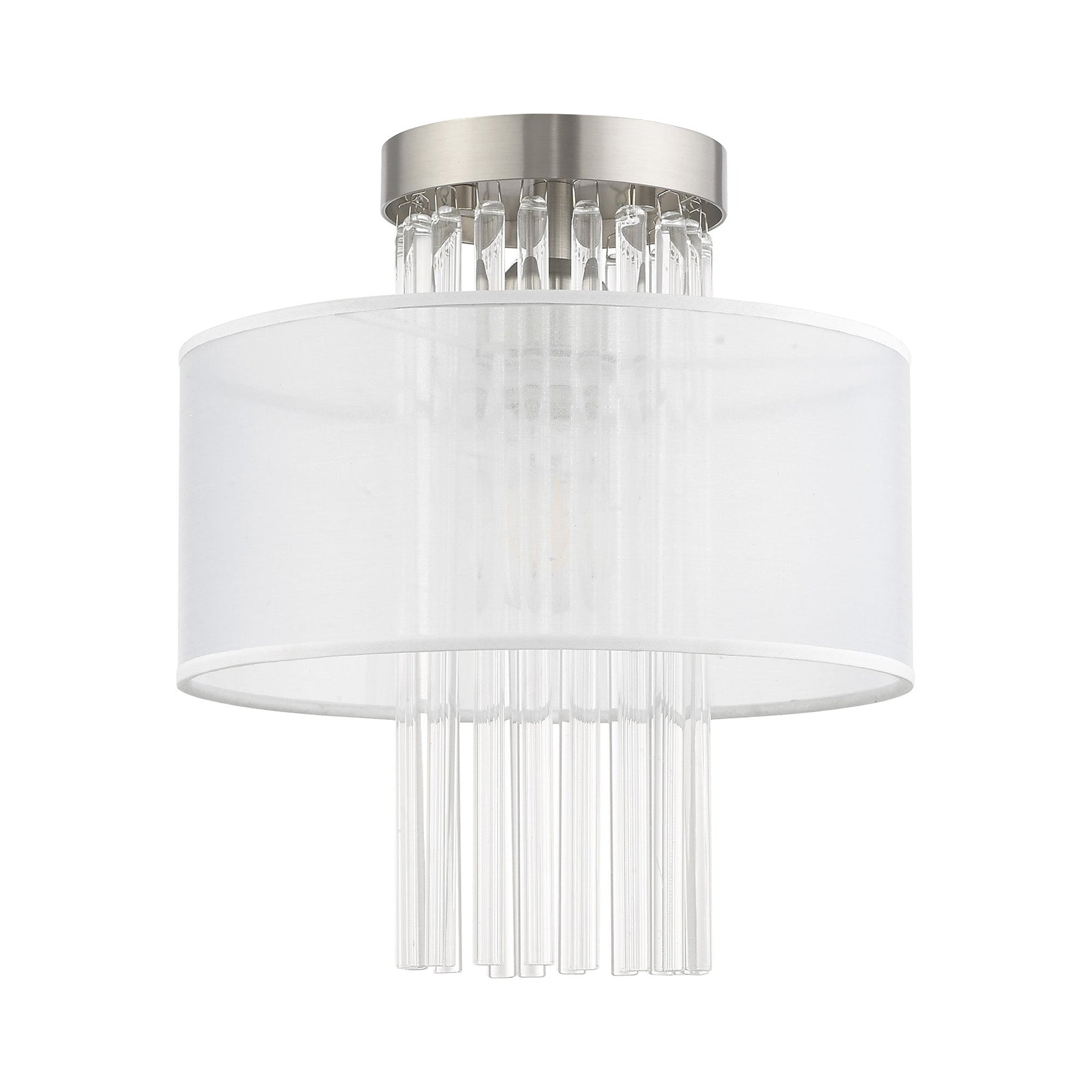 The Alexis Semi-Flush Ceiling Mount, item number 41144-91, brings a touch of contemporary elegance to your decor. Standing 12.5 inches high with an 11-inch diameter, this fixture features a brushed nickel finish that beautifully complements the cascading grade-A K9 crystal rods and the hand-crafted translucent fabric shade. It accommodates one medium base bulb (not included) with a maximum wattage of 40W, making it a perfect choice for soft ambient lighting. The fixture is suitable for damp locations, ensuring versatility in various settings.