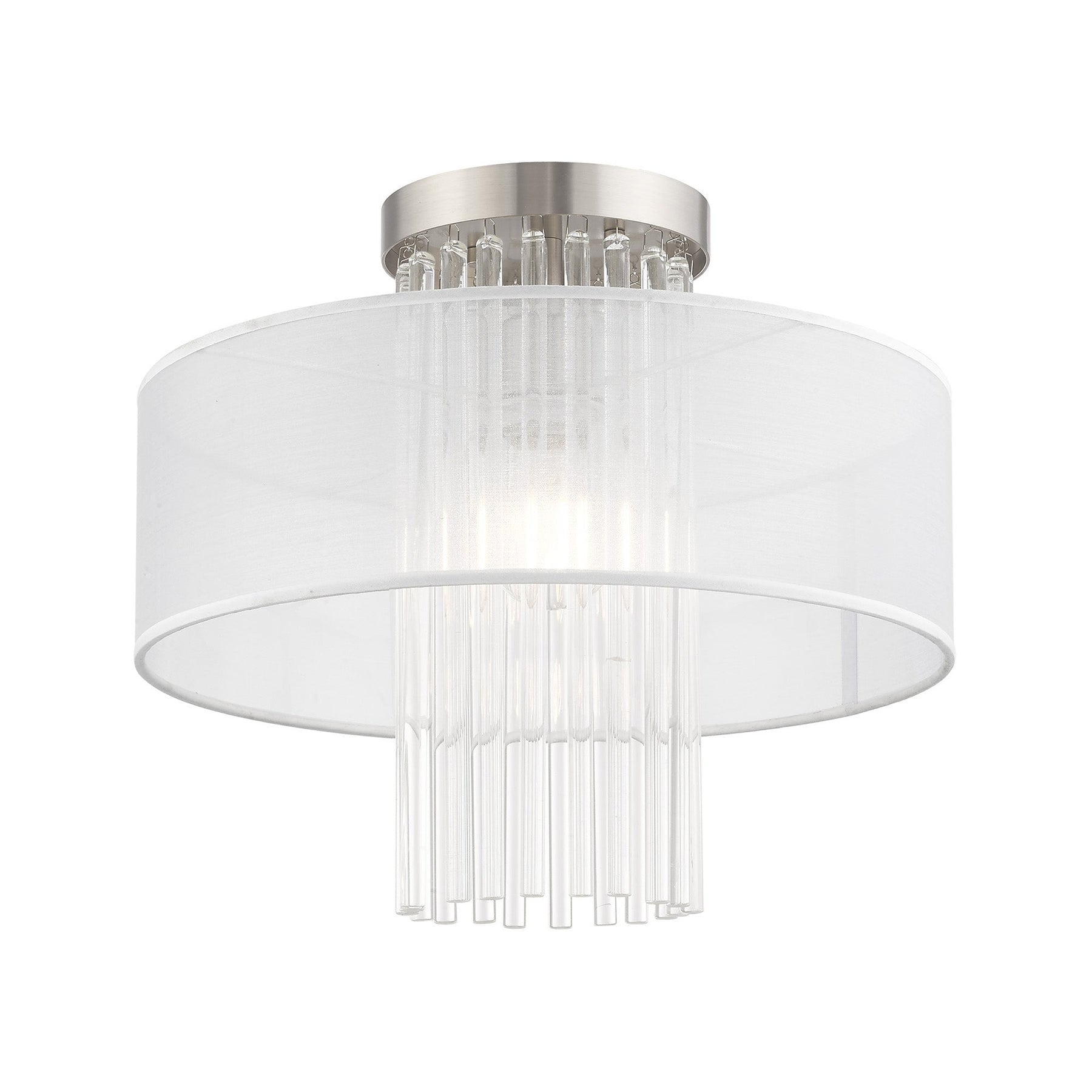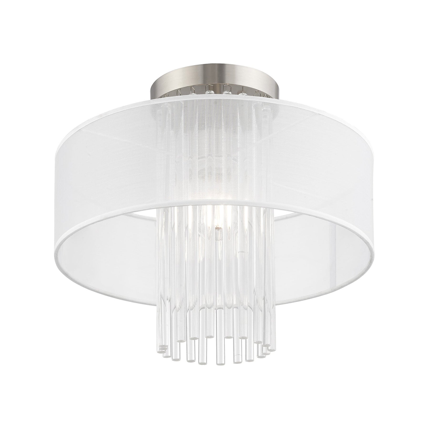 The Alexis Semi-Flush Mount ceiling fixture, item number 41146-91, elevates contemporary decor with its luxurious design. With a height of 13.5 inches and a diameter of 15 inches, it features a stunning brushed nickel finish complemented by exquisite grade-A K9 crystal rods and a hand-crafted translucent fabric shade. This fixture is designed for one medium base bulb (not included) with a maximum wattage of 60W. Suitable for damp locations, it combines style and functionality, making it a perfect fit for various spaces in your home.