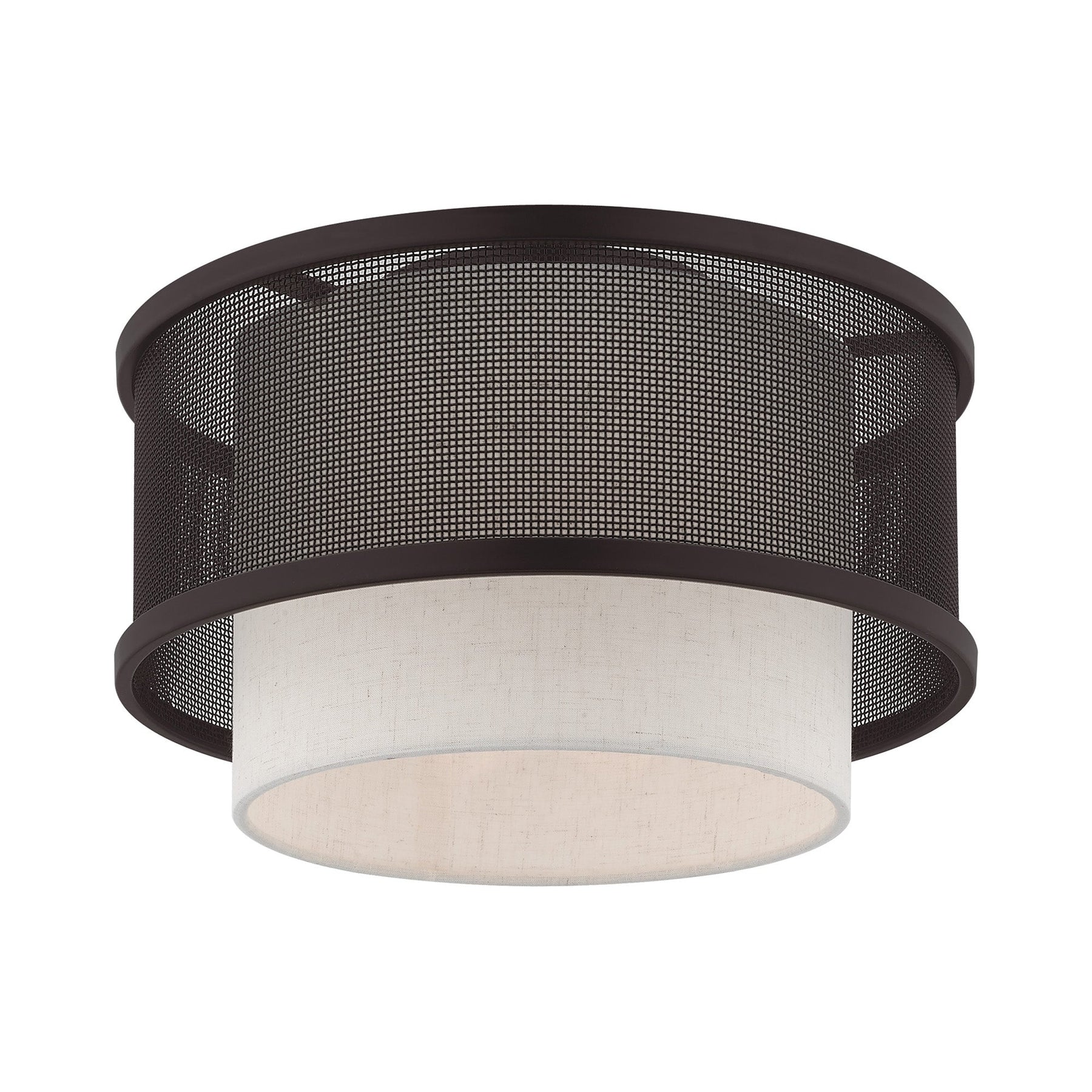 The 41207-07 Braddock Flush Mount Ceiling Fixture is a stylish addition to your modern living area, featuring a bronze finish that adds a touch of urban elegance. With a diameter of 12 inches and a height of 7.5 inches, it is perfectly sized for a variety of spaces. The fixture is adorned with a handcrafted oatmeal fabric hardback shade, surrounded by a durable stainless steel mesh, offering both texture and sophistication. It requires one medium base bulb (not included) with a maximum wattage of 60W. This fixture is suitable for damp locations, enhancing its versatility for areas like bathrooms or kitchens, while its transitional style complements a range of decor themes.