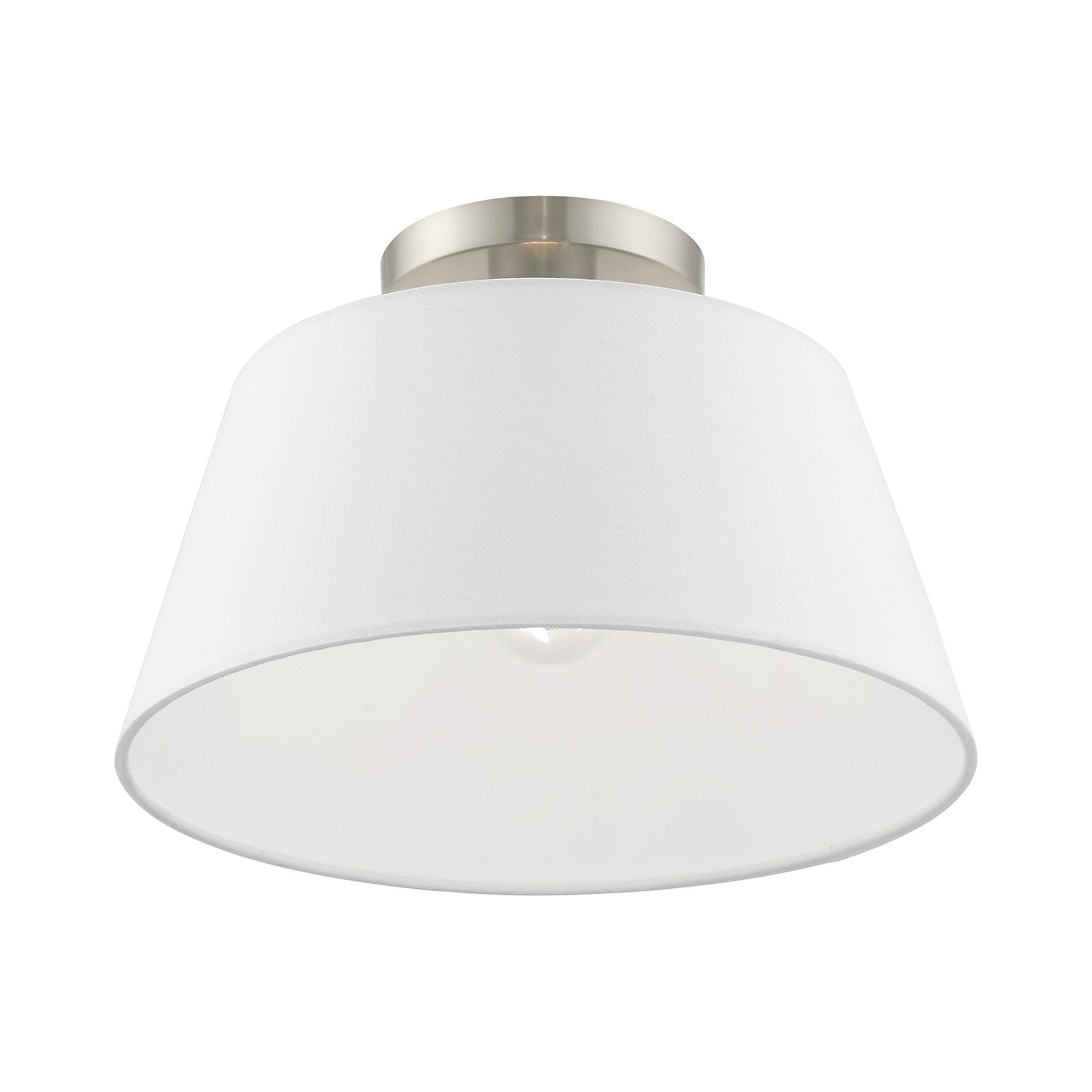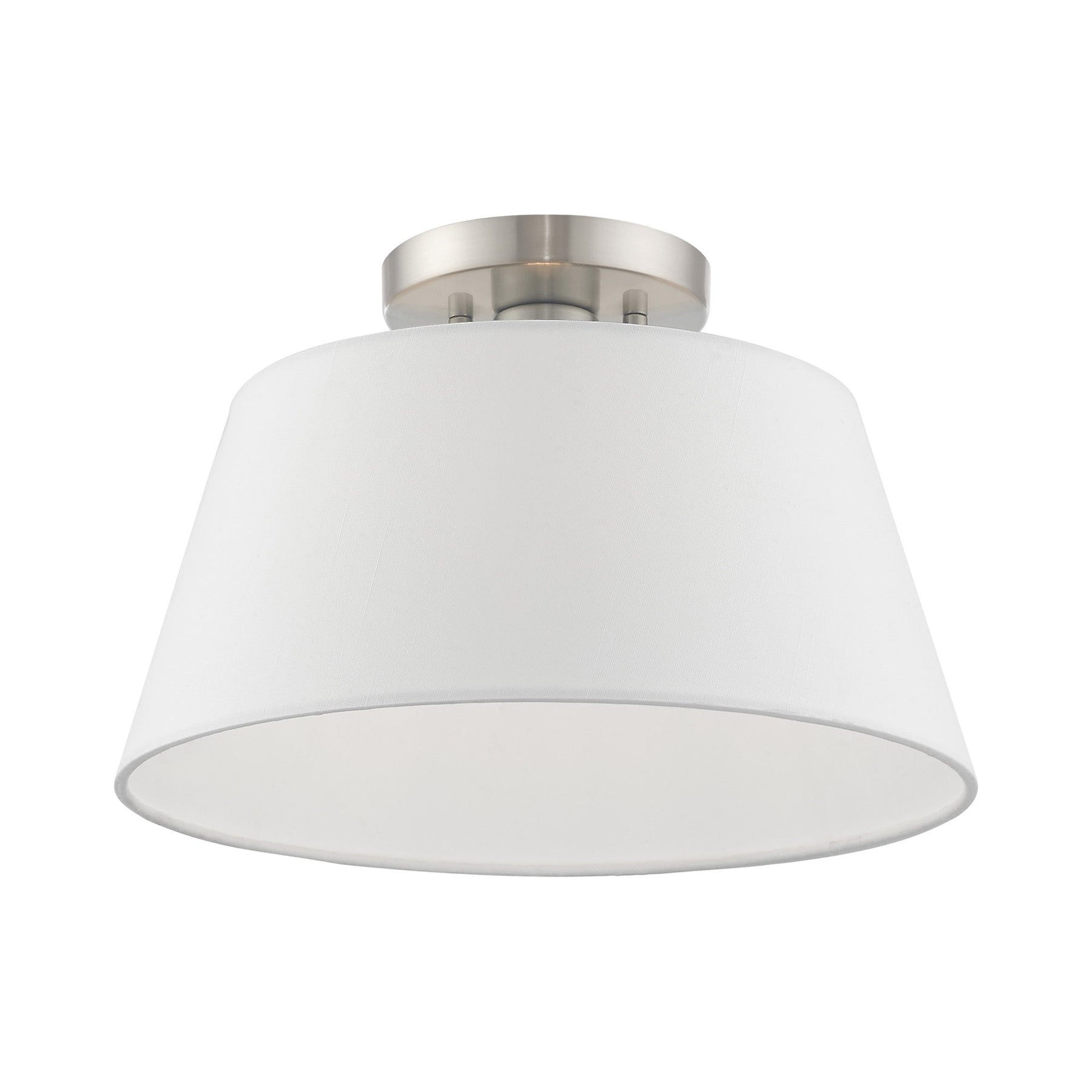 The 41312-91 Belclaire Ceiling Mount is a stunning addition to any transitional decor. It features a sleek brushed nickel frame complemented by a stylish hand crafted off-white fabric hardback drum shade. With a height of 8.5 inches and a diameter of 13 inches, this semi-flush fixture requires one medium base bulb (not included) with a maximum wattage of 60W. The canopy measures 5.125 inches in diameter and the design is suitable for damp locations, making it an ideal choice for various settings.