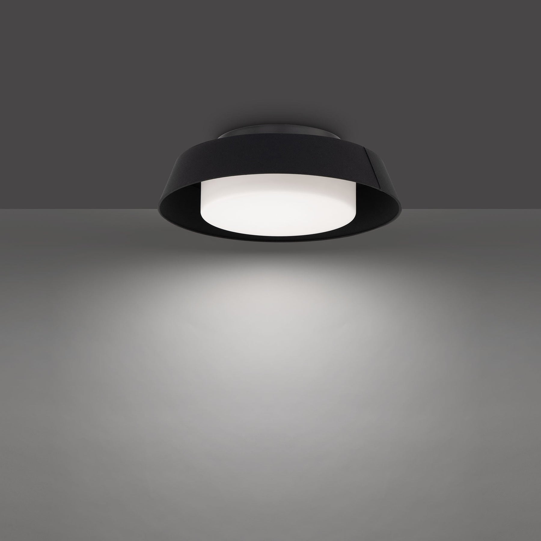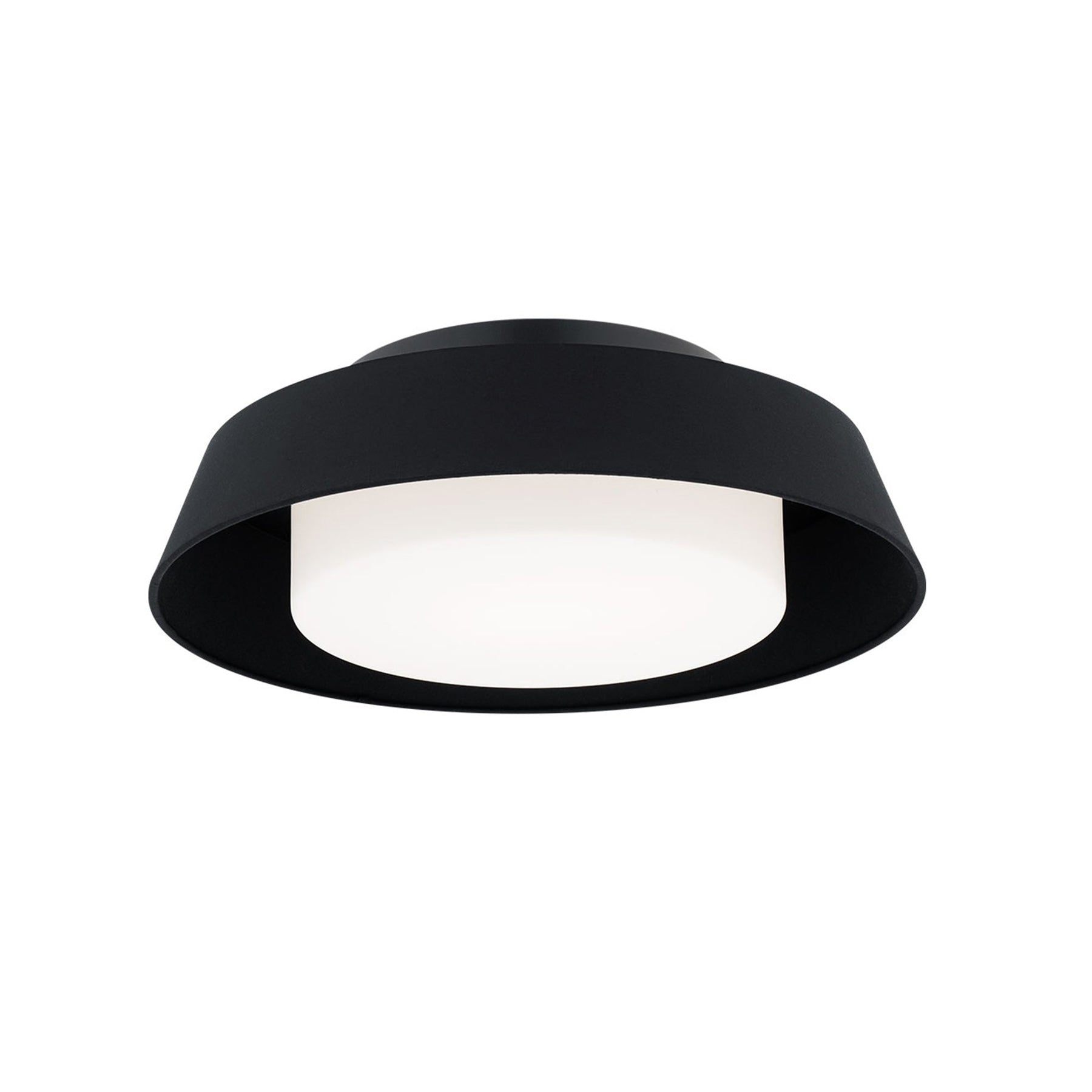 Chapeau 16in LED Flush Mount 3500K in Black. A fabric shade caps a white, etched opal diffuser, bringing timeless elegance to rooms graced with its presence. Featuring aluminum construction, a fabric shade, and glass diffuser Chapeau damp location listed - it can be used indoor or covered outdoor areas Equipped with a 120V AC input LED driver that is concealed within the canopy for easy installation over a standard or pancake junction box. Smooth and continuous dimming with an electronic low voltage (ELV) or TRIAC dimmer. High Powered Replaceable LED with CRI: 90, Rated Hours: 50,000, Selectable Color Temp: 2700K-3000K-3500K-4000K Standards: ETL & cETL UL 1598 listed for Damp Locations. CEC Title 24 Compliant, and ADA Compliant.