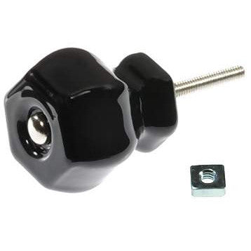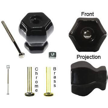 Jet black milk glass cabinet knobs - made from the finest silica glass and were individually hand made by professional glass workers. Measure 1 1/2 inches (38 mm) in diameter (measured from point to point on the hexagonal) and they have a projection of 1 1/2 inches (38 mm). Sold individually and come with the 2 1/2 inch Chrome mounting hardware. If you desire a flush finish on both sides of the cabinet - we suggest the use of Chrome or Brass caps. These metal caps fit into the glass - allowing the bolt to be screwed in from behind - providing an identical look and a flush finish (shown in the photo below).