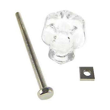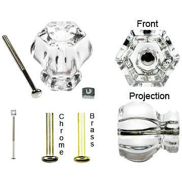 Glass specialty drawer knobs for end tables, specialty drawer knobs, small furniture drawers, medicine cabinets and restoration of vintage furniture. These glass cabinet door hardware measure nominally 1 inch (25 mm) in diameter (measured point to point on the hexagonal at the widest point) and they have a projection of 1 inch (25 mm). Sold individually with the removable Chrome 2 1/2 inch (64 mm) hardware. Brass hardware also available.