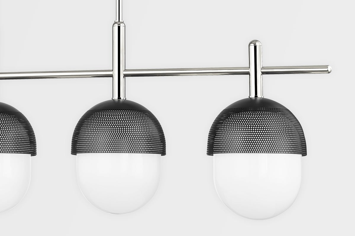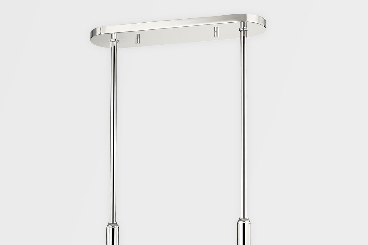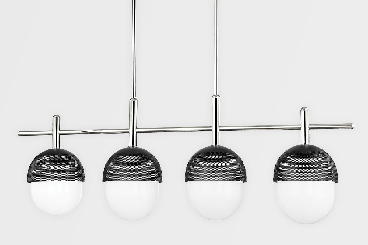 The Nyack 4-Light Pendant from Hudson Valley Lighting is a striking addition to any space, boasting a sleek design that complements modern decor. This elegant fixture, featuring a stunning glass shade, measures 9 inches in height and 52 inches in length. It accommodates four E26 medium base bulbs (not included), with a maximum wattage of 60W each, providing ample illumination. The pendant is available in a sophisticated polished nickel and black finish and is rated UL Damp, making it suitable for humid environments.