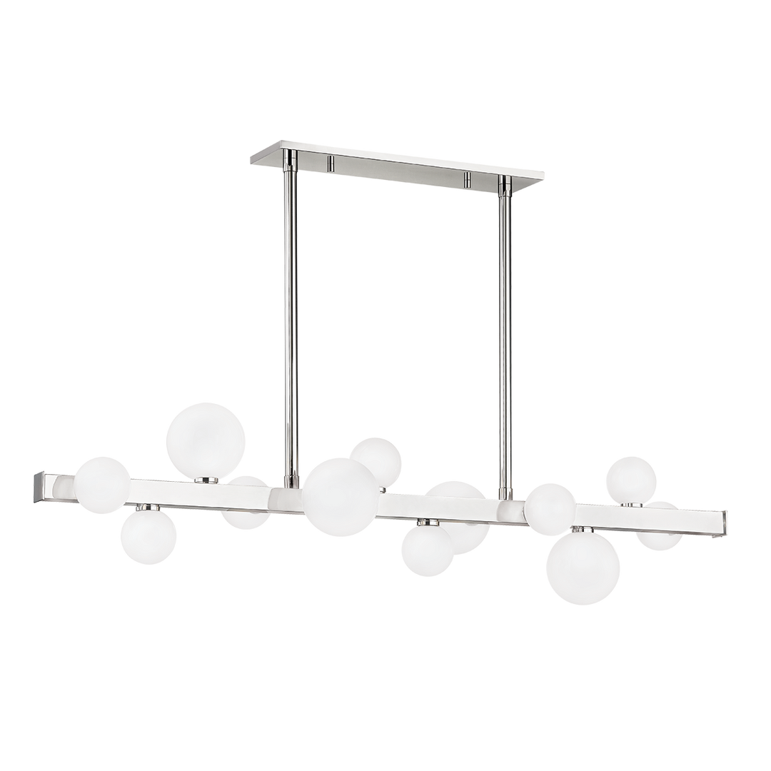 The Mini Hinsdale by Hudson Valley Lighting is a striking fixture that enhances any space with its elegant design. Featuring a frosted glass shade, it provides soft illumination with its 12 G9 LED bulbs (not included), rated at 4.00 watts each. The dimensions of this fixture are 11.00 inches in width, 10.00 inches in height, and it stretches to 44.50 inches in length. With finish options in Aged Brass or Polished Nickel, it is sure to fit seamlessly into your decor. Additionally, the unit is UL Damp rated, making it suitable for use in areas with higher moisture levels.